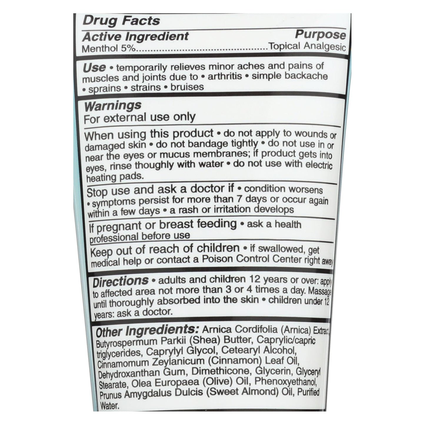ingredients : arnica cordifolia;arnica;extract;butyrospermum parkii;shea;butter;caprylic/capric triglycerides. Caprylyl glycol;cetearyl alcohol;cinnamomum zeylanicum;cinnamon;leaf oil;dehydroxanthan gum;dimethicone;glycerin;glyceryl stearate;olea europaea;olive;oil;phenoxyethanol;prunus amygdalus dulcis;sweet almond;purified water;menthol 5% purpose topical analgesic
