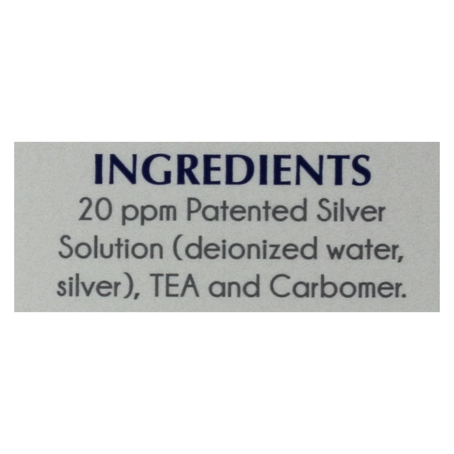 ingredients : 20 ppm patented silver solution;deionized water;silver;tea and carbomer