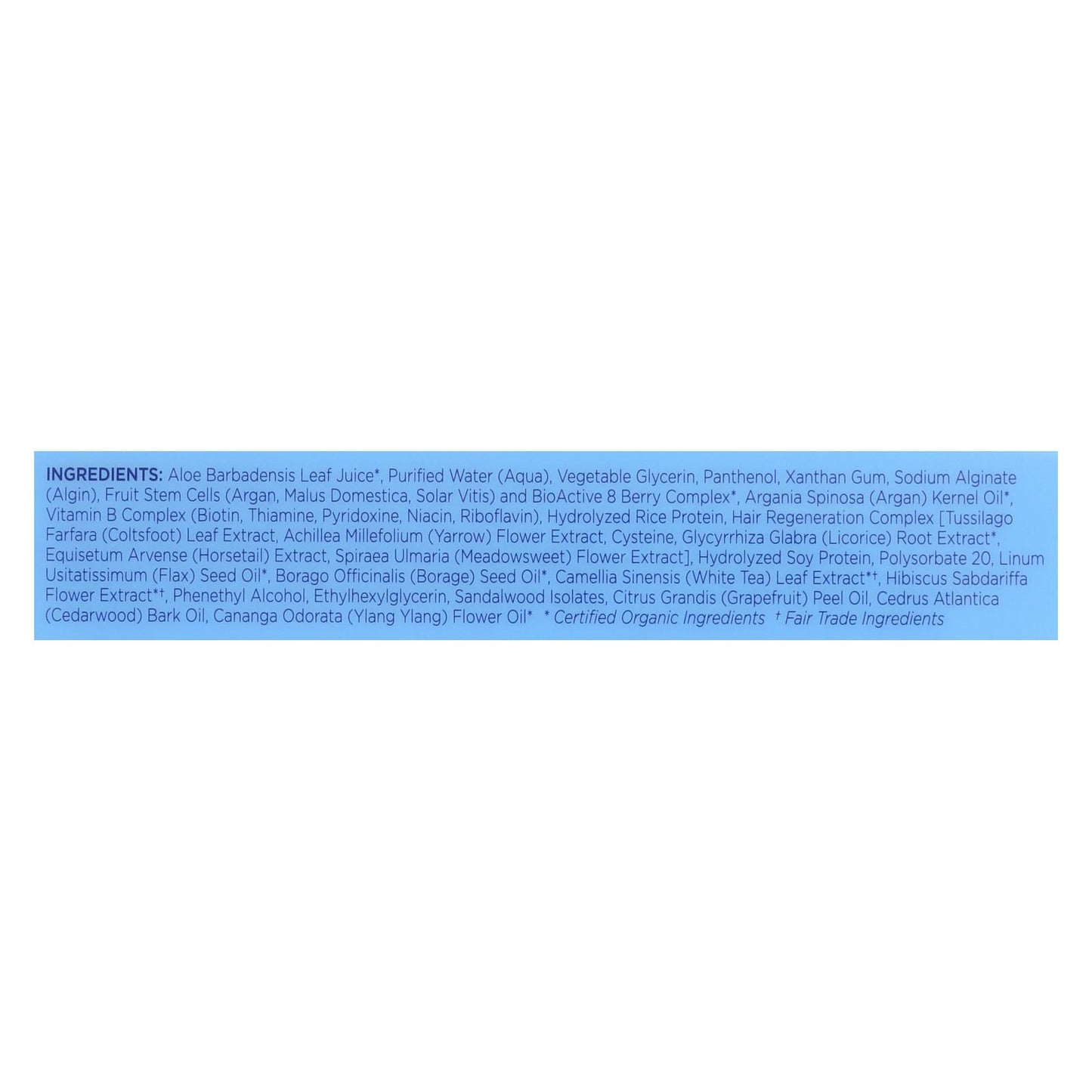 ingredients : aloe barbadensis juice;purified water;aqua;vegetable glycerin;panthenol;xanthan gum;sodium alginate;algin;fruit stem cells;argan;malus domestica;solar;vitis;and bioactive 8 berry complex;argania spinosa;kernel oil;vitamin b complex;biotin;thiamine;pyridoxine;niacin;riboflavin;hydrolyzed rice protein;hair regeneration complex [tussilago farfara;coltsfoot;leaf extract;achillea millefolium;yarrow;flower extract;cysteine;glycyrrhiza glabra;licorice;root extract;equisetum arvense;horsetail;extract;sp