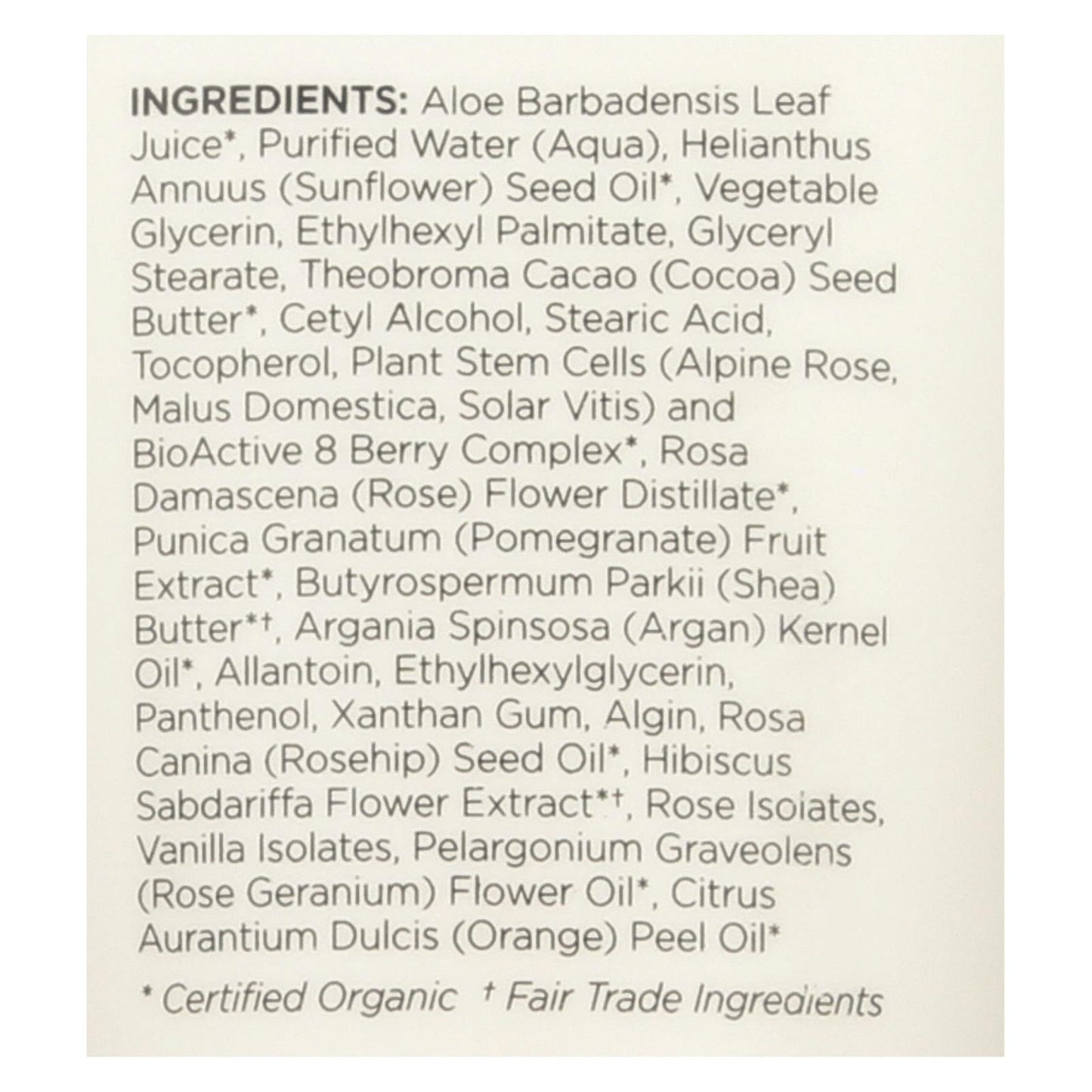 ingredients : aloe barbadensis leaf juice;purified water;aqua;helianthus annuus;sunflower;seed oil;vegetable glycerin;ethylhexyl palmitate;glyceryl stearate;theobroma cacao;cocoa;seed butter;cetyl alcohol;stearic acid;tocopherol;plant stem cells;alpine rose;malus domestica;solar vitis;and bioactive 8 berry complex;rosa damascena;rose;flower distillate;punica granatum;pomegranate;fruit extract;butyrospermum parkii;shea;butter*†;argania spinsosa;argan;kernel oil;allantoin;ethylhexylglycerin;pantothenol;xanthan