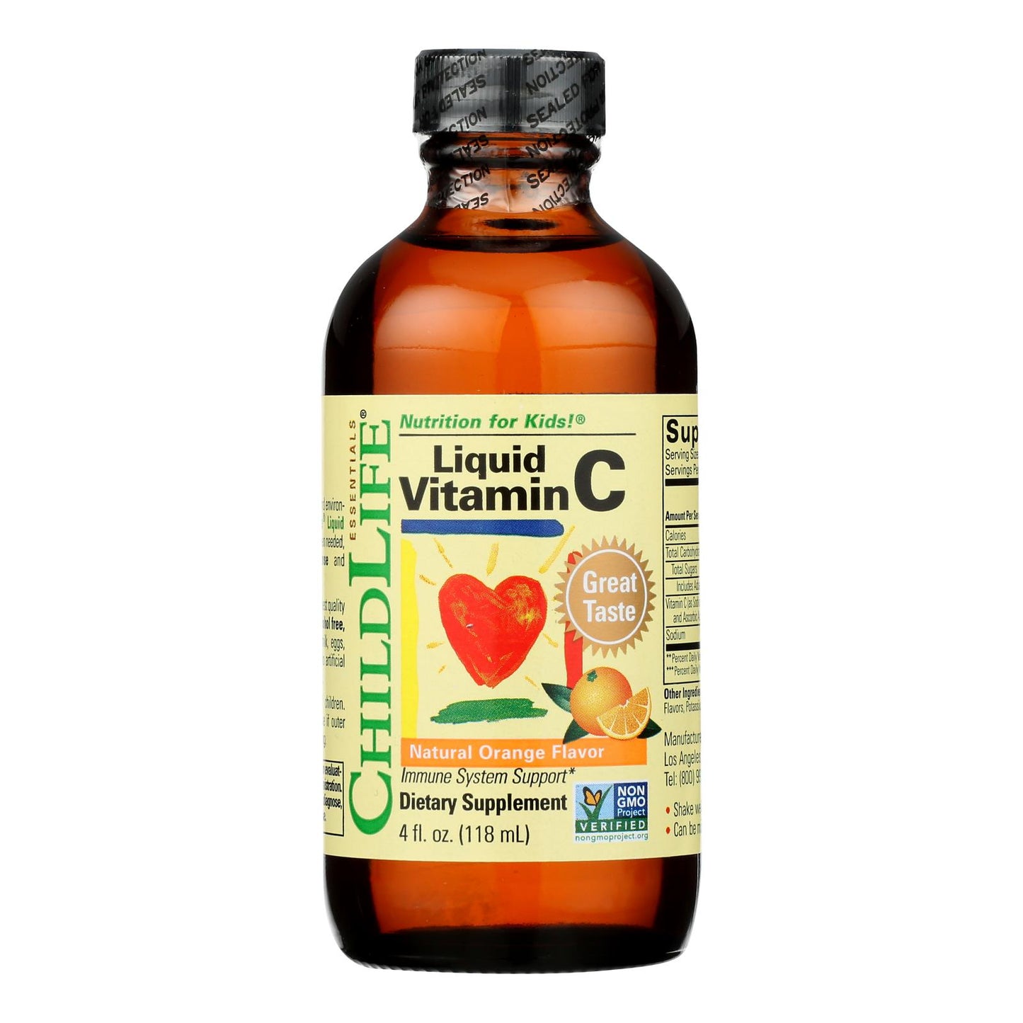 CHILD LIFE ESSENTIALS, LIQUID VITAMIN C, ORANGE IS RECOMMENDED FOR CHILDREN. THIS PRODUCT USES ONLY THE HIGHEST QUALITY INGREDIENTS, IS CASEIN FREE AND CONTAINS NO ALCOHOL. CHILD LIFE ESSENTIALS, LIQUID VITAMIN C, ORANGE IS GLUTEN-FREE AND DOES NOT CONTAIN MILK, EGGS, WHEAT, YEAST, OR CORN AND COMES IN A 4 FL. OZ. BOTTLE. THIS PRODUCT DOES NOT HAVE ARTIFICIAL COLORINGS, FLAVORINGS OR SWEETENERS. PLEASE SEE NUTRITIONAL FACTS PANEL FOR POSSIBLE ALLERGENS AND WARNINGS PERTAINING TO CHILD LIFE ESSENTIALS, LIQUID VITAMIN C, ORANGE.