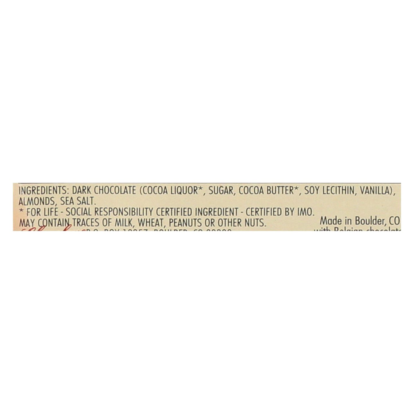 Chocolove almonds and sea salt in dark chocolate bar is a 1.3 oz. Bar with dark semisweet chocolate, whole dry roasted almonds and sea salt. At first bite, crunchy almonds release their flavor in a swirl with chocolate. The sea salt crystals continually reset your sweet taste buds and make a tantalizing taste combination that keeps you wanting more. Our chocolate is made with cocoa certified by imo as for life, which means it was farmed in a socially responsible and ethical manner. All of the cocoa bean derived ingredients in this chocolate are certified for life. See the nutrition facts panel for allergens.
