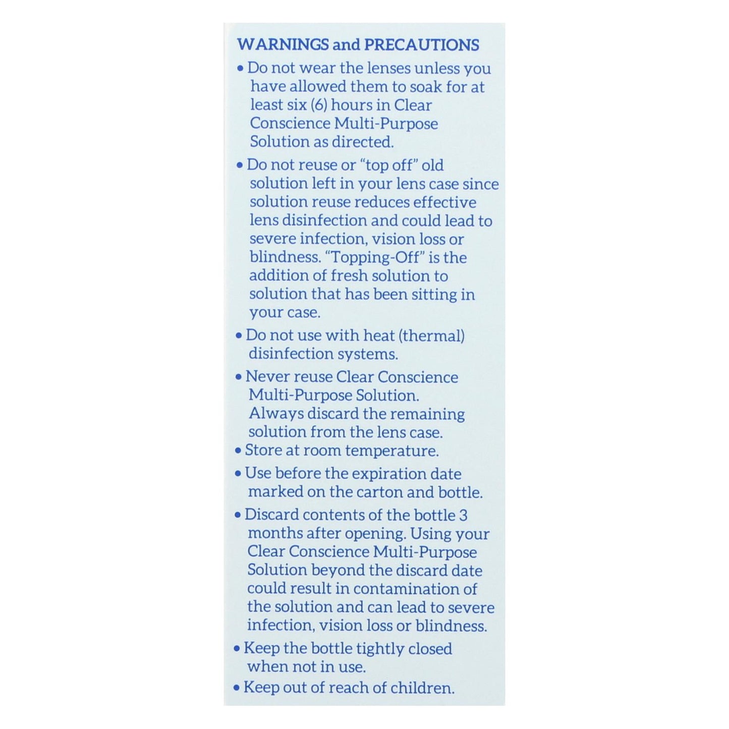 Clear conscience multi-purpose soft contact lens solution is a safe and effective lens care solution for soft, hydrophilic contact lenses. our product is intended only for cleaning, disinfecting, removing protein from, rinsing and storing your soft contact lenses. This isotonic solution is sterilized by filtration, never by irradiation. This bottle contains 3 fl. Oz of solution.