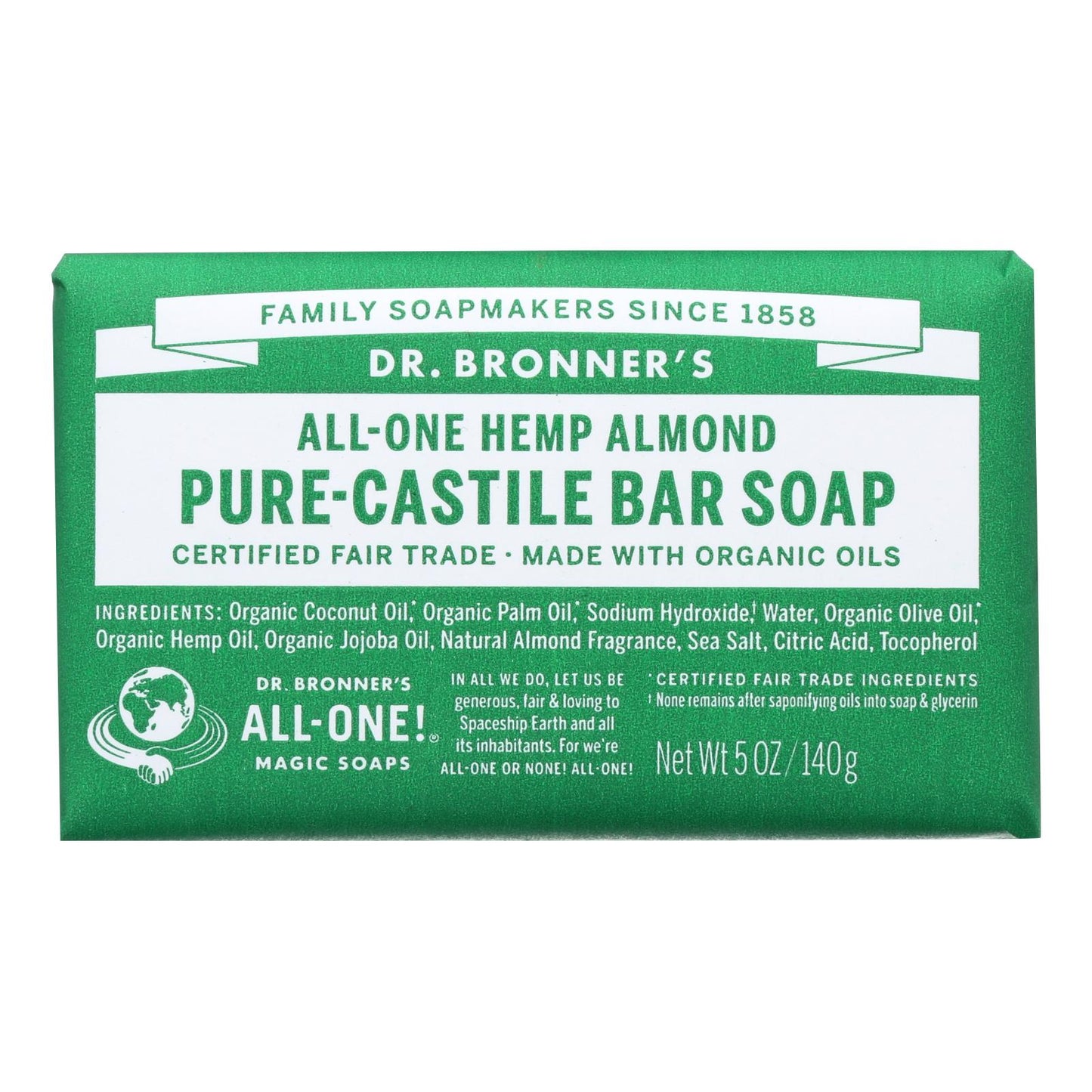 DR. BRONNER’S PURE-CASTILE HEMP ALMOND BAR SOAP IS WARM, COMFORTING AND SLIGHTLY SWEET LIKE MARZIPAN OR AMARETTO. IT IS GENTLE AND VERSATILE, GOOD FOR WASHING THE BODY, FACE OR HAIR. IT IS MADE WITH CERTIFIED FAIR TRADE INGREDIENTS AND ORGANIC HEMP OIL FOR A SOFT, SMOOTH LATHER THAT WON'T DRY YOUR SKIN. WE ALSO ENSURE THAT NO ANIMAL TESTING IS INVOLVED IN OUR PROCESSES BECAUSE WE DON'T BELIEVE IN SIMPLY CREATING A BETTER PRODUCT, BUT IN CREATING A BETTER PLANET. THIS PRODUCT IS CERTIFIED ORGANIC, NON-GMO AND CRUELTY FREE. INCLUDES ONE 5 OZ. BAR OF DR. BRONNER’S PURE-CASTILE HEMP ALMOND BAR SOAP. PLEASE REVIEW WARNING PANEL BEFORE USE. OVER 150 YEARS AND FIVE GENERATIONS OF SOAP EXCELLENCE.