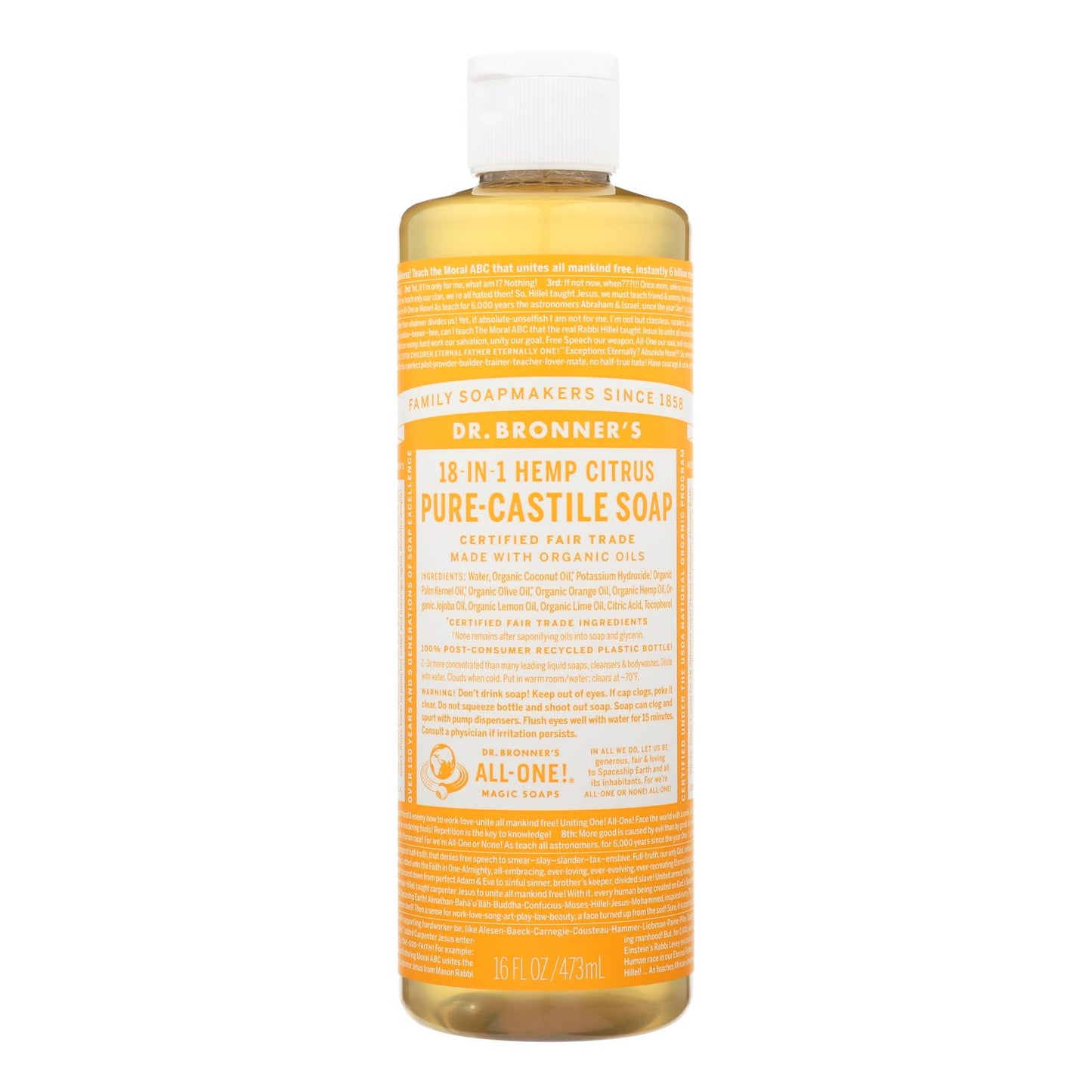 DR. BRONNER’S PURE-CASTILE HEMP CITRUS SOAP IS FRESH AND BRIGHT WITH AN INVIGORATING BLEND OF ORGANIC ORANGE, LEMON AND LIME OILS. IT IS CONCENTRATED, BIODEGRADABLE, VERSATILE AND EFFECTIVE. IT IS GOOD FOR JUST ABOUT ANY CLEANING TASK. USE IT FOR BODY WASHING, DISHES, LAUNDRY, MOPPING OR PETS. WE ALSO ENSURE THAT NO ANIMAL TESTING IS INVOLVED IN OUR PROCESSES BECAUSE WE DON'T BELIEVE IN SIMPLY CREATING A BETTER PRODUCT, BUT IN CREATING A BETTER PLANET. THIS PRODUCT IS CERTIFIED ORGANIC, NON-GMO AND CRUELTY FREE. INCLUDES ONE 16 FL. OZ. BOTTLE OF DR. BRONNER’S PURE-CASTILE HEMP CITRUS SOAP. PLEASE REVIEW WARNING PANEL BEFORE USE. OVER 150 YEARS AND FIVE GENERATIONS OF SOAP EXCELLENCE.