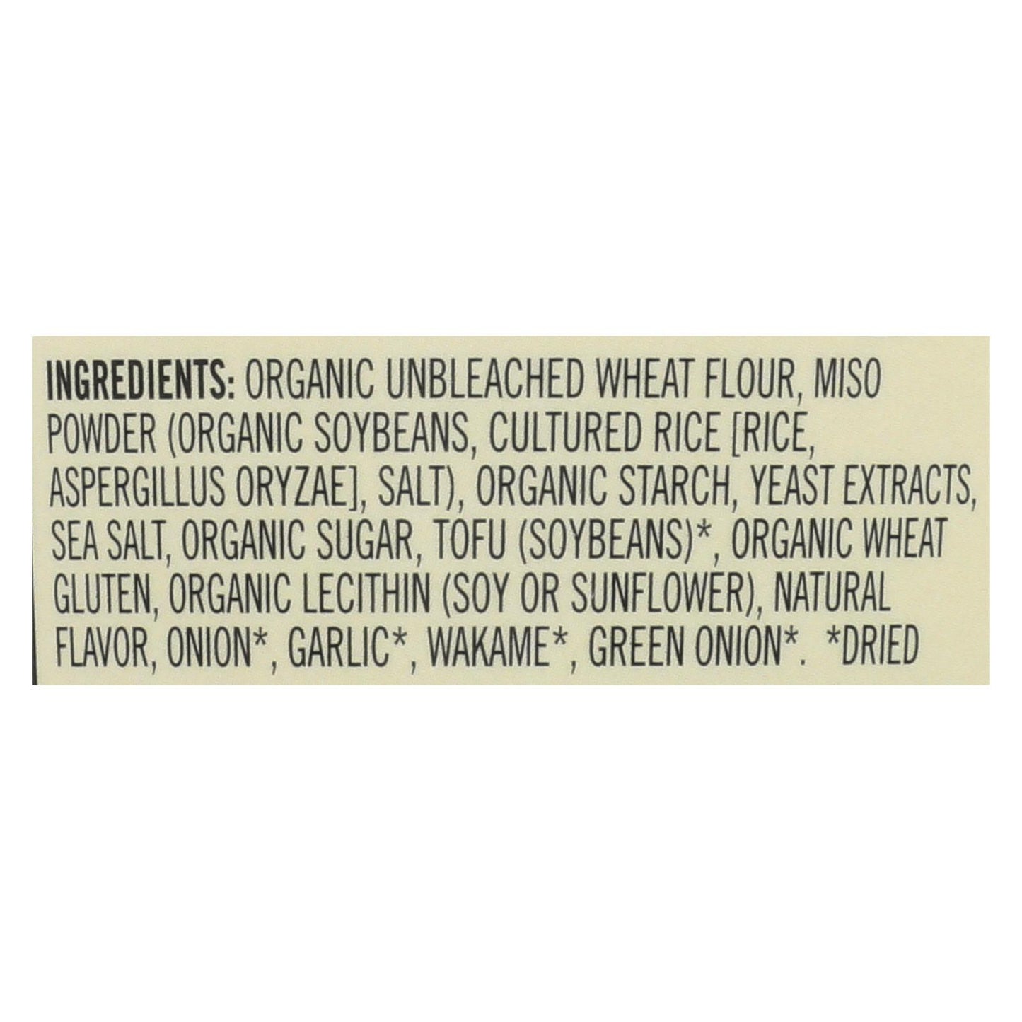 ingredients : organic unbleached wheat flour;miso powder;organic soybeans;cultured rice [rice;aspergillus oryzae];salt;organic starch;yeast extracts;sea salt;organic sugar;tofu;soybeans;organic wheat gluten;organic lecithin;soy or sunflower;natural flavor;onion;garlic;wakame;green onion