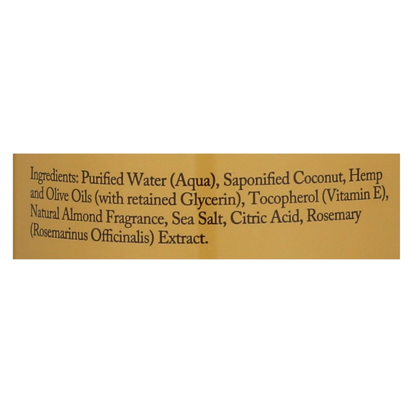 ingredients : purified water;aqua;saponifed coconut;hemp and olive oils;with retained glycerin;tocopherol;vitamin e;natural almond fragrance;sea salt;citric acid;rosemary;rosemarinus officinalis;extract