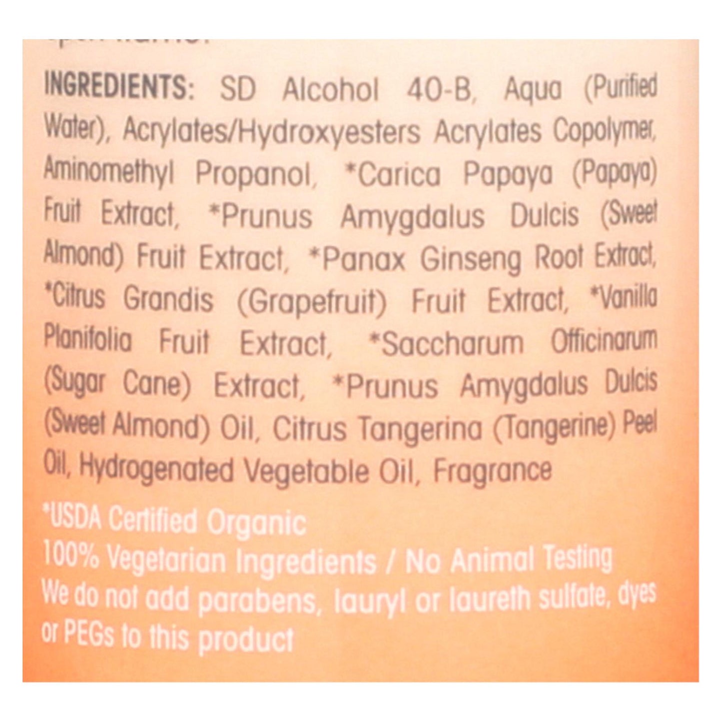 ingredients : sd alcohol 40-b;aqua;purified water;acrylates/hydroxyesters acrylates copolymer;aminomethyl propanol;carica papaya;papaya;fruit extract;prunus amygdalus dulcis;sweet almond;panax ginseng root extract;citrus grandis;grapefruit;vanilla plantifolia fruit extract;saccharum officinarum;sugar cane;extract;oil;citrus tangerina;tangerine;peel oil;hydrogenated vegetable oil;fragrance