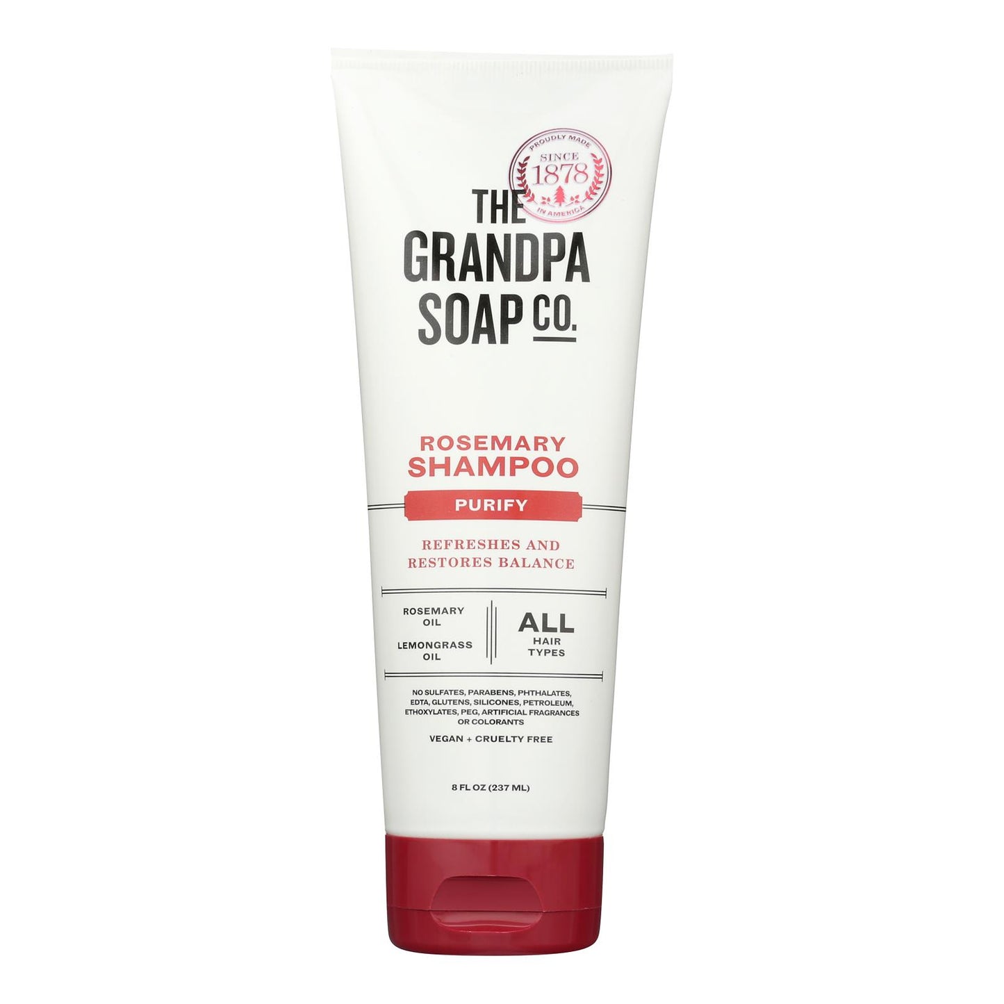 THE GRANDPA SOAP CO. ROSEMARY SHAMPOO REFRESHES AND RESTORES BALANCE. THIS FORMULA IS FREE OF PARABENS, SULFATES AND ARTIFICIAL FRAGRANCES. IT CONTAINS STIMULATING ROSEMARY OIL AND CLEANSING LEMONGRASS THAT WORK TOGETHER TO PURIFY AND RESTORE BALANCE TO LEAVE SCALP AND HAIR FEELING CLEAN. A PERFECTLY PURIFYING FORMULA FOR ALL HAIR TYPES. NATURAL AND GENTLE ENOUGH FOR DAILY USE. INCLUDES ONE 8 FL. OZ. BOTTLE OF SHAMPOO. HARDWORKING, SIMPLE, PURE INGREDIENTS ARE THE HEART OF OUR NATURAL SOAPMAKING TRADITION.