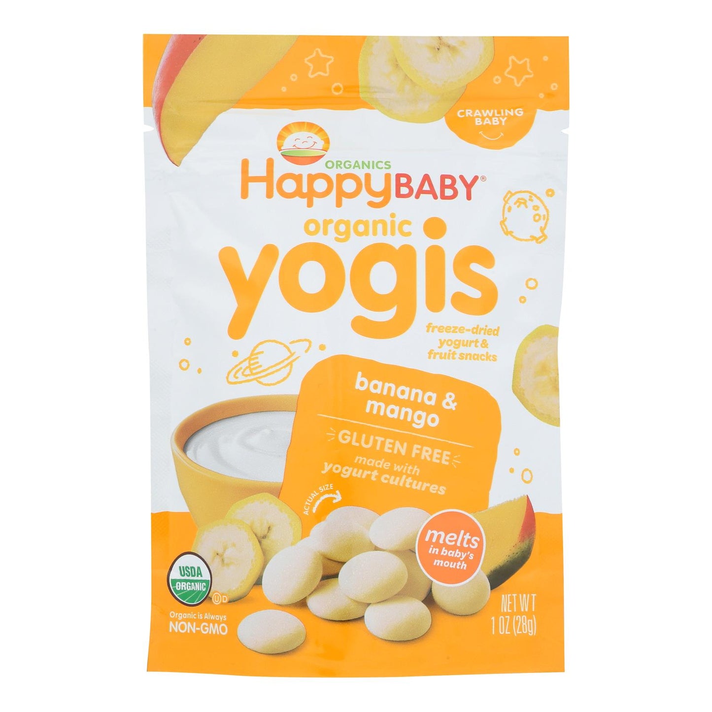HAPPY BABY ORGANIC YOGIS, BANANA MANGO ARE MADE BY REAL MOMS. THIS PRODUCT MELTS IN BABY’S MOUTH AND DOES NOT CONTAIN GELATIN OR ARTIFICIAL FLAVORS. HAPPY BABY ORGANIC YOGIS COME PACKAGED DRY FOR YOUR CONVENIENCE IN A BPA-FREE RESEALABLE POUCH AND CONTAINS 1 OZ. OF PRODUCT. THIS PRODUCT IS CERTIFIED USDA ORGANIC AND CONTAIN PROBIOTICS TO HELP MAINTAIN DIGESTIVE HEALTH.
