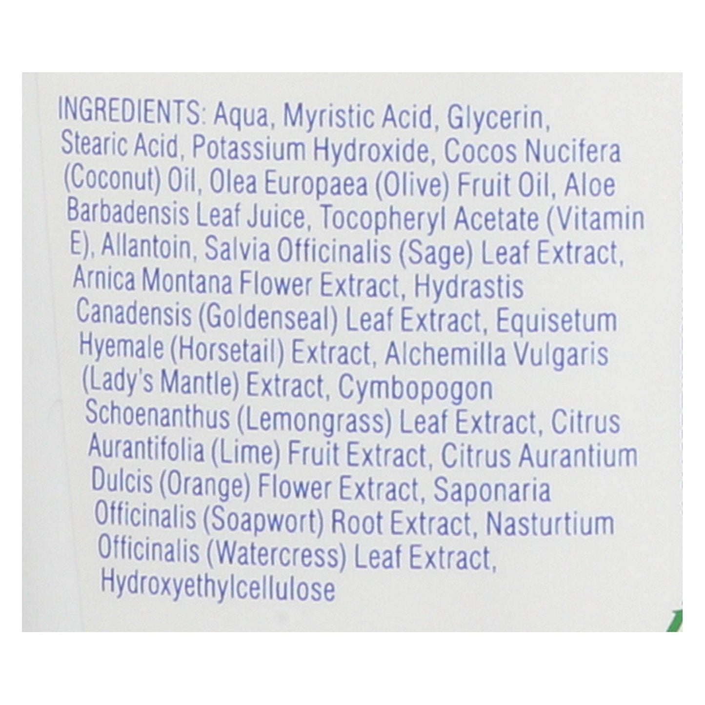 ingredients : aqua;myristic acid;glycerin;stearic acid;potassium hydroxide;cocos nucifera;coconut;oil;olea europaea;olive;fruit oil;aloe barbadensis leaf juice;tocopheryl acetate;vitamin e;allantoin;salvia officinalis;sage;leaf extract;arnica montana flower extract;hydrastis canadensis;goldenseal;equisetum hyemale;horsetail;extract;alchemilla vulgaris;lady's mantle;cymbopogon schoenanthus;lemongrass;citrus aurantifolia;lime;fruit extract;citrus aurantium dulcis;orange;flower extract;saponaria officinalis;soap