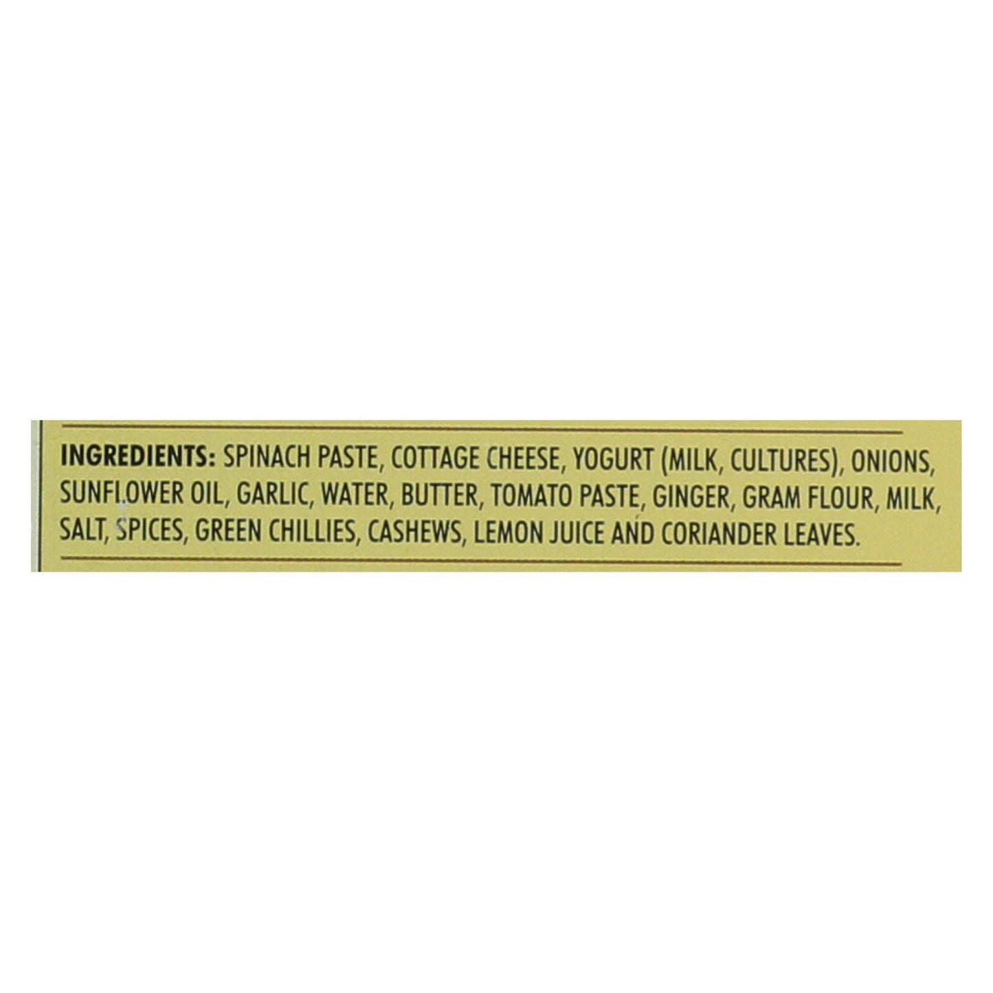 ingredients : spinach paste;cottage cheese;yogurt (milk, cultures);onions;sunflower oil;garlic;water;butter;tomato paste;ginger;gram flour;milk;salt;spices;green chillies;cashews;lemon juice and coriander leaves