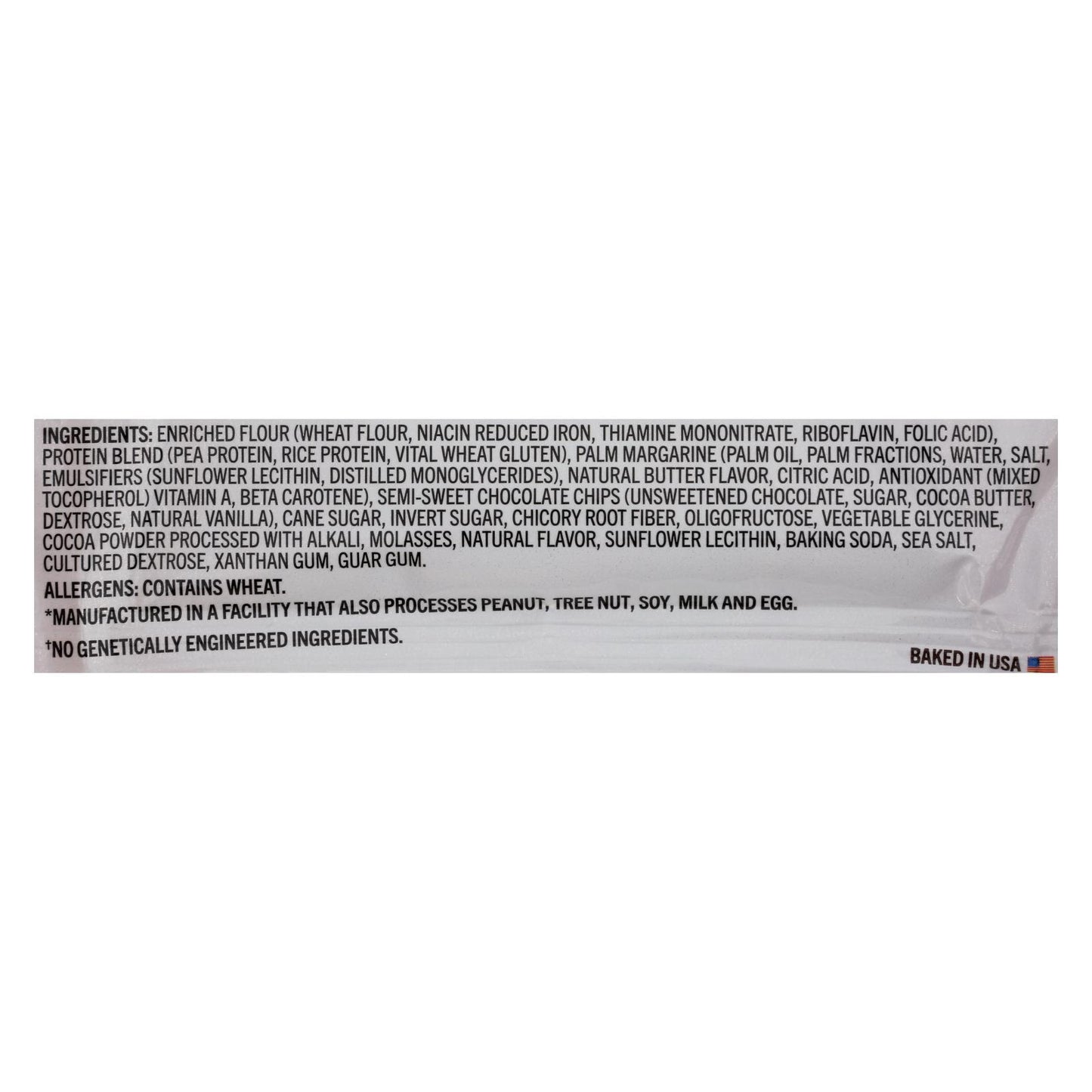 ingredients : enriched wheat flour;wheat flour;niacin;reduced iron;thiamine mononitrate;riboflavin;folic acid;protein blend;vital wheat gluten;pea protein;rice protein;chicory root fiber;invert sugar;semi-sweet chocolate chips;unsweetened chocolate;sugar;cocoa butter;dextrose;natural vanilla extract;cane sugar;palm fruit oil;vegetable glycerine;cocoa powder processed with alkali;sunflower lecithin;molasses;natural flavor;baking soda;salt;xanthan gum;guar gum