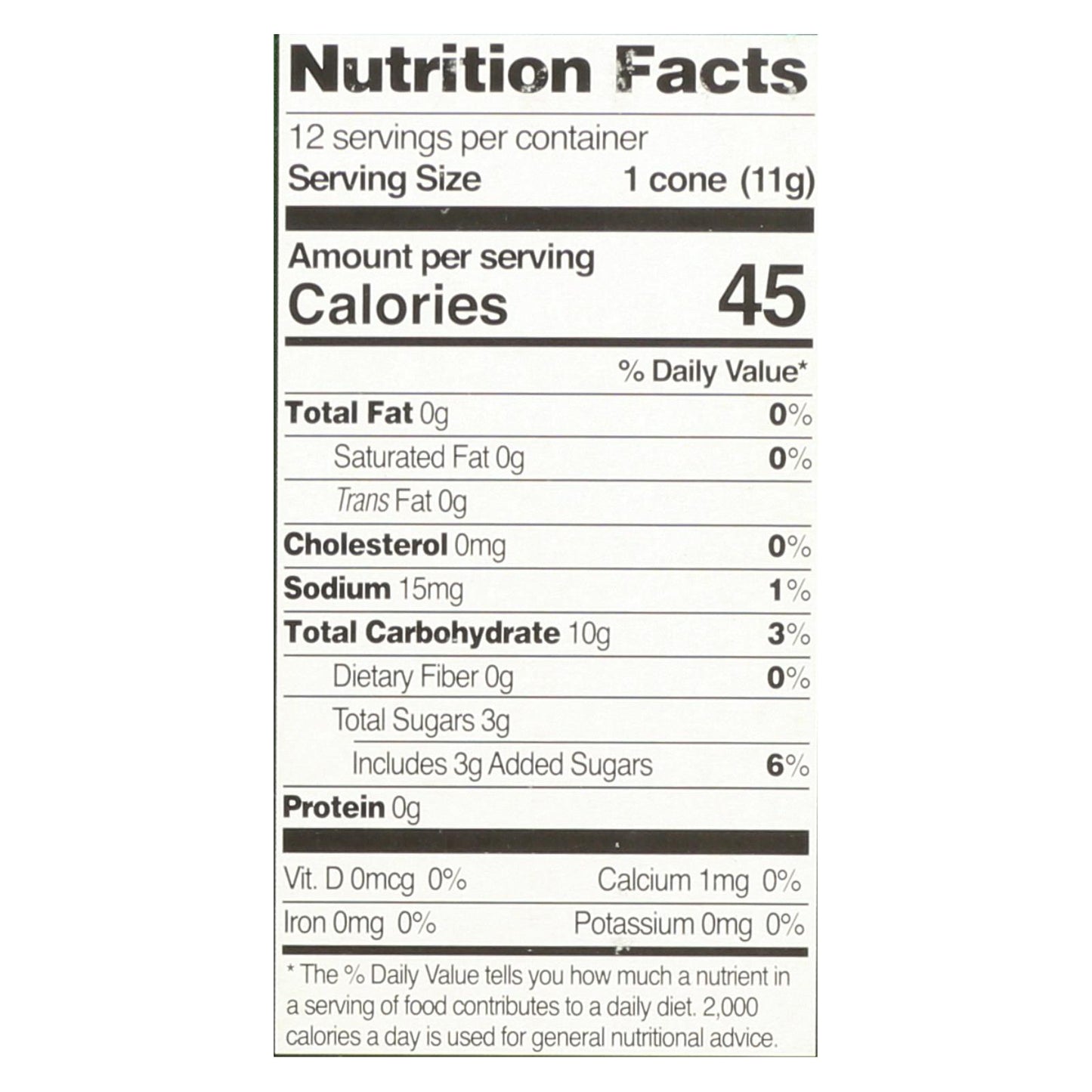 Let's do… gluten free sugar cones are our traditional-style rolled cones that come in a 4.6 oz. Box. Each box has 12 vegan friendly cones that are certified gluten-free. Our sugar cones are non-gmo project verified and orthodox union kosher certified. Each cone has 45 calories and are free of trans fat.