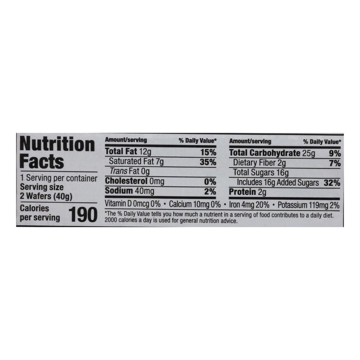 ingredients : dark chocolate;fair trade certified™ unsweetened chocolate;fair trade certified™ sugar;fair trade certified™ cocoa butter;sunflower lecithin;enriched wheat flour;wheat flour;niacin;iron;thiamine;riboflavin;folic acid;palm oil;sugar;skimmed cocoa powder;sugar cane fiber;soy lecithin;salt;sea salt;ascorbic acid