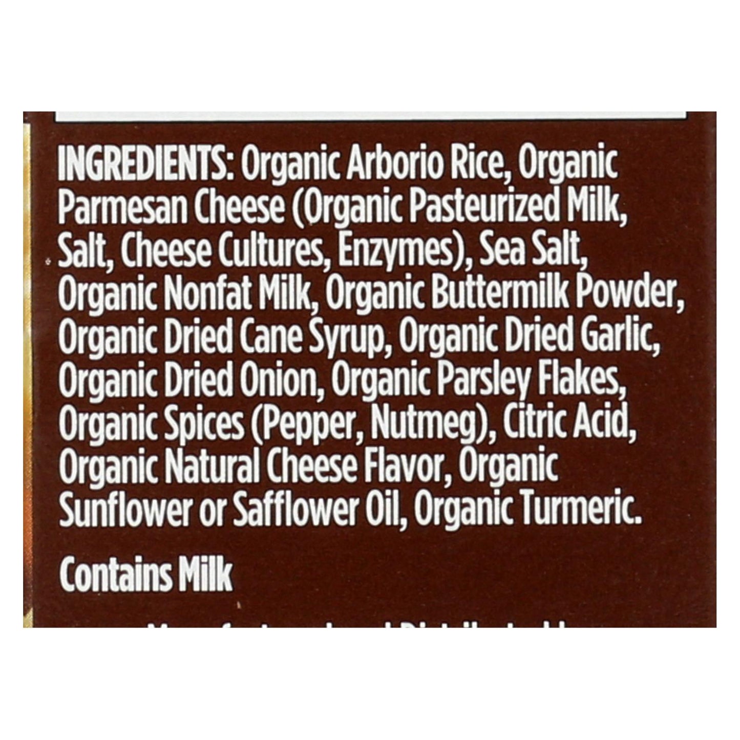 ingredients : organic arborio rice;organic parmesan cheese;organic pasteurized milk;salt;cheese cultures;enzymes;sea salt;organic nonfat milk;organic buttermilk powder;organic dried cane syrup;organic dried garlic;organic dried onion;organic parsley flakes;organic spices;pepper;nutmeg;citric acid;organic natural cheese flavor;organic sunflower or safflower oil;organic turmeric
