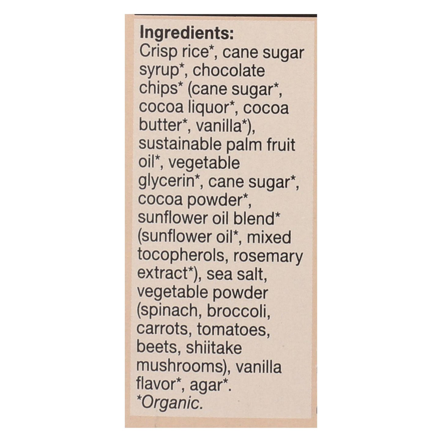 ingredients : brown rice crisps;invert cane syrup;chocolate chips;cane sugar;unsweetened chocolate;cocoa butter;palm fruit oil*†;vegetable glycerin;inulin;cocoa powder;tapioca starch;brown rice syrup;salt;vegetable extracts;spinach;broccoli;carrots;tomatoes;beets;shiitake mushrooms;natural flavor