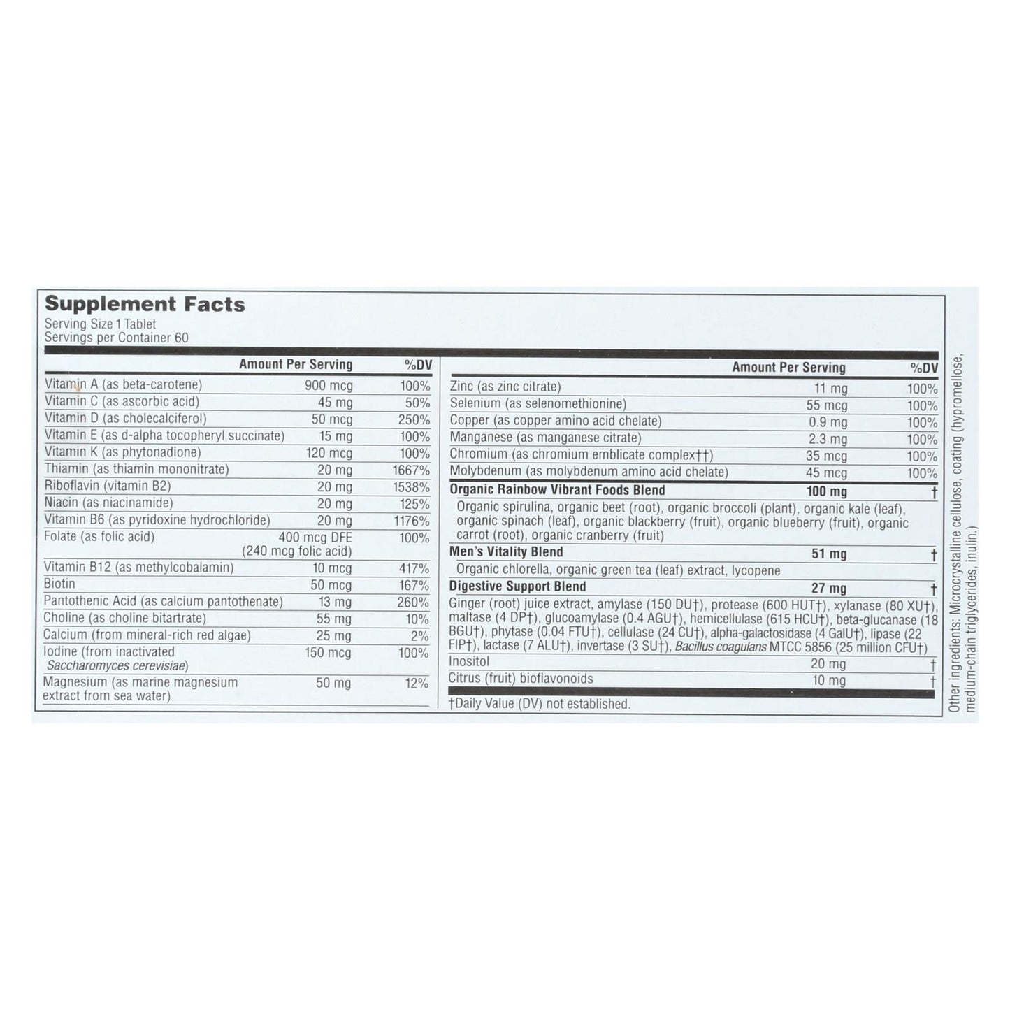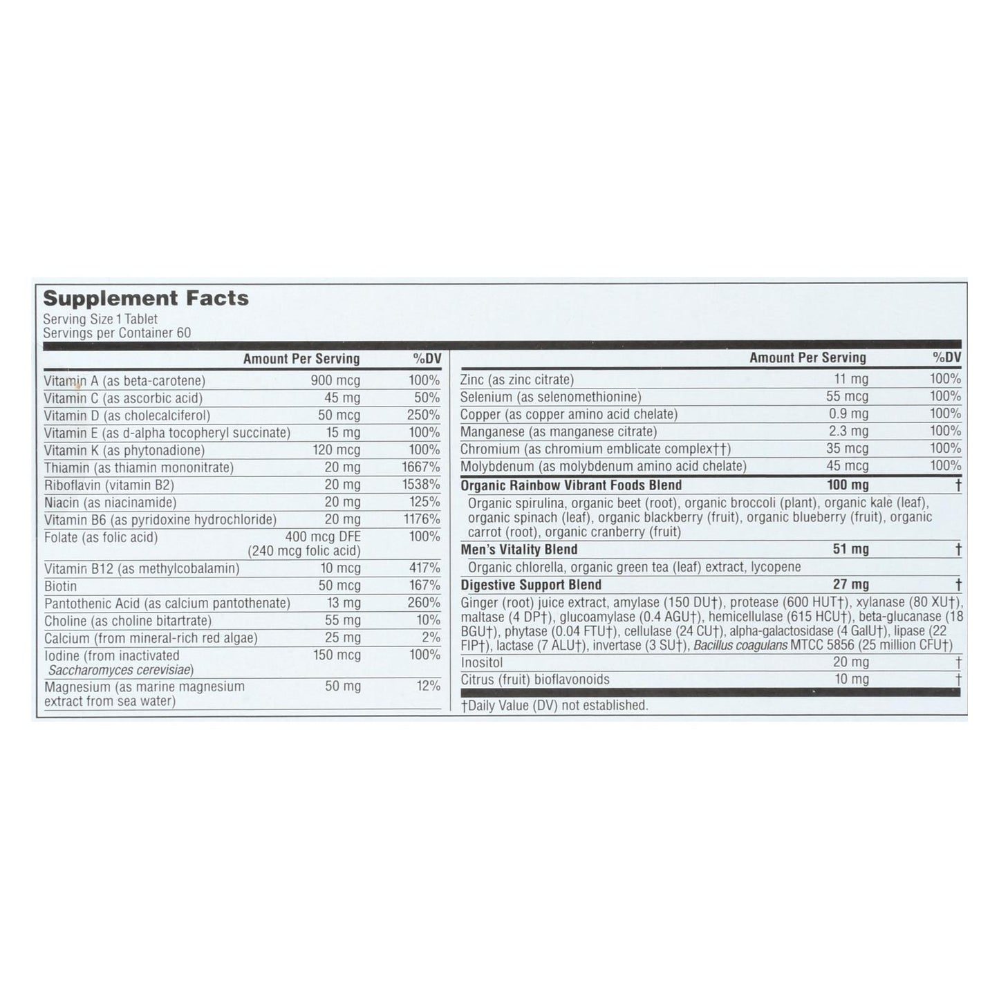 Multivitamin Supplement. Gluten-free. Vegetarian. Purity Safeguard: Made purity-tested ingredients and no artificial preservatives, colors, flavors or sweeteners. Contains No: gluten, wheat, milk, tree nuts, peanuts, eggs, fish or shellfish. Non GMO Project verified. nongmoproject.org. New & improved. Nourish your body for energy & vitality. Be healthy and vital! Nourish your body with our comprehensive multivitamin that delivers clinically researched ingredients, our rainbow blend of fruits and vegetables, plus a unique Men’s Vitality Blend to fuel your vitality at the cellular level. What a Difference 1 Tablet Per Day Makes: promotes energy and vigor with potent B vitamins; supports immune function with zinc, selenium, and vitamin C and E; easy to digest; with probiotics and plant-source enzymes. Truly Custom Nutrition for Your Truly Vibrant Life: At Rainbow Light, we believe the supplements you take should be designed to meet the needs of your lifestyle, in order to help you live a healthy and vibrant life. Here’s what you can expect from what’s inside this box: Mindful Formulations: Clinically researched ingredients in potencies that meet or exceed daily values, to support a vibrant, healthy lifestyle. Fruits, Vegetables and Non-GMO Project Verified: Made with fruits and vegetables and ingredients that are not genetically engineered. Made with fruits, vegetables & probiotics. www.rainbowlight.com. Eco Guard Packaging: 100% recycled & 100% recyclable. Tree-free labels made from limestone. Certified 100% recycled paperboard. Recyclable. (These statements have not been evaluated by the Food and Drug Administration. This product is not intended to diagnose, treat, cure or prevent any disease.)