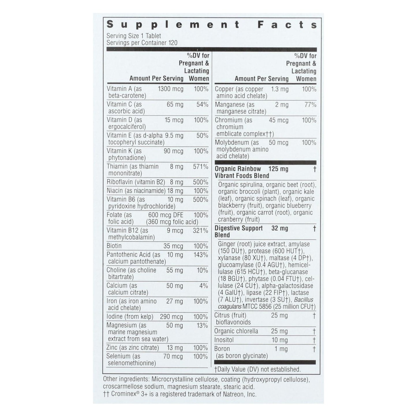 Multivitamin Supplement. Plus fruits, vegetables & probiotics. Gluten-free. Vegetarian. Purity Safeguard: Made purity-tested ingredients and no artificial preservatives, colors, flavors or sweeteners. Contains no: gluten, wheat, milk, tree nuts, peanuts, eggs, fish or shellfish. Non GMO Project verified. nongmoproject.org. New & improved. Essential nutrition for mom & baby. One tablet per day. Healthy mom, healthy baby! Nourish your body with our comprehensive multivitamin that delivers scientifically researched ingredients, our rainbow blend of fruits and vegetables, and an advanced digestive support blend designed just for mom and baby from conception through nursing. What a Difference 1 Tablet Per Day Makes: nourishes mom’s health and baby’s development with the recommended amount of folate, plus calcium, choline and a gentle, well-tolerated form of iron; promotes cell & immune health and energy with potent vitamins; easy to digest; with probiotics and plant-source enzymes. Truly Custom Nutrition for Your Truly Vibrant Life: At Rainbow Light, we believe the supplements you take should be designed to meet the needs of your lifestyle, in order to help you live a healthy and vibrant life. Here’s what you can expect from what’s inside this box: Mindful Formulations: Scientifically studied ingredients in potencies that support a vibrant, healthy lifestyle. Non-GMO Project Verified: Plus fruits, vegetables and other ingredients that are not genetically engineered. www.rainbowlight.com. Eco Guard Packaging: 100% recycled & 100% recyclable. Tree-free labels made from limestone. Certified 100% recycled paperboard. Recyclable. (These statements have not been evaluated by the Food and Drug Administration. This product is not intended to diagnose, treat, cure or prevent any disease.)
