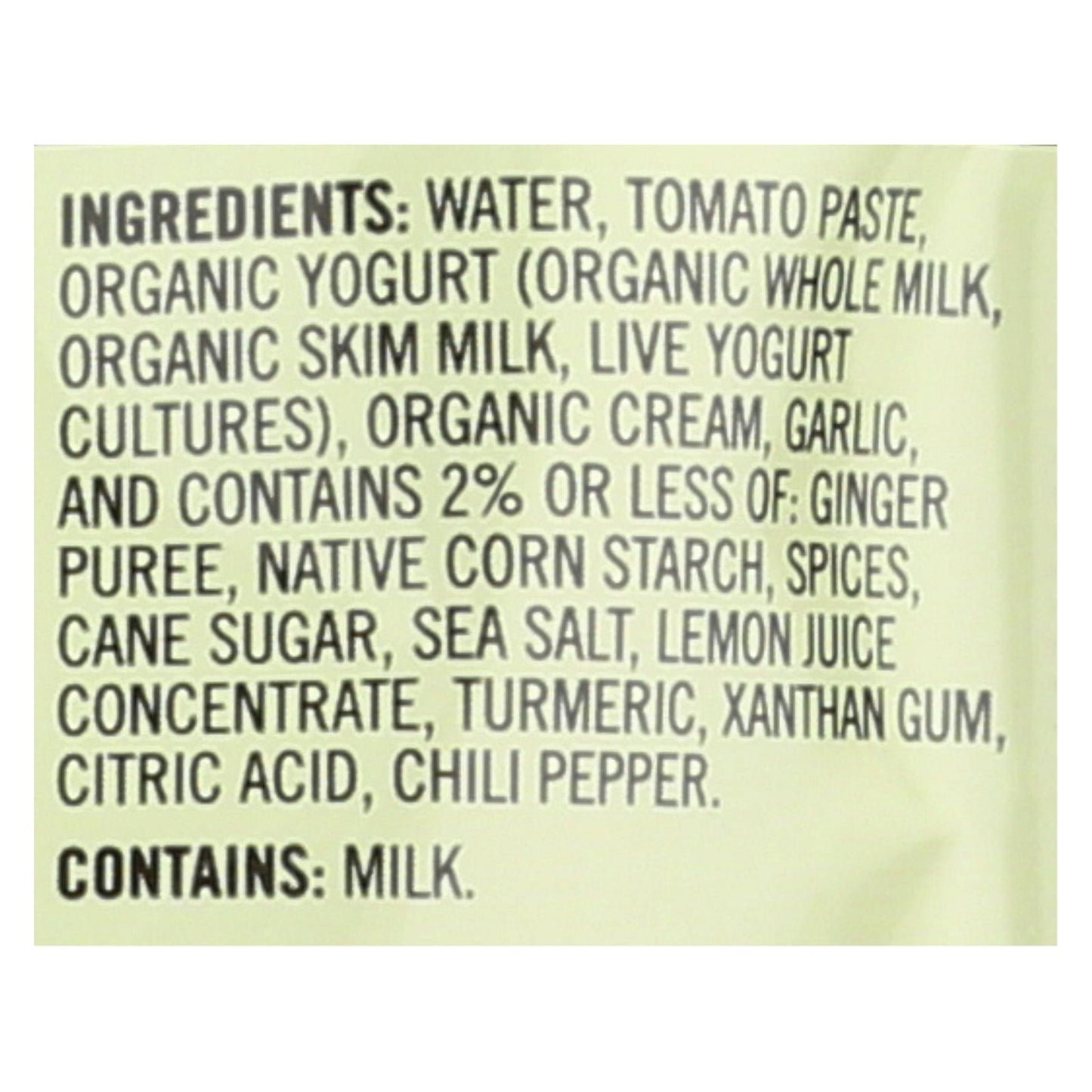 ingredients : water;tomato paste;organic yogurt;organic whole milk;organic skim milk;live yogurt cultures;organic cream;garlic and contain 2% or less of: garlic;ginger;sea salt;cane sugar;spices;native corn starch;lemon juice concentrate;turmeric;citric acid;red chili pepper;xanthan gum