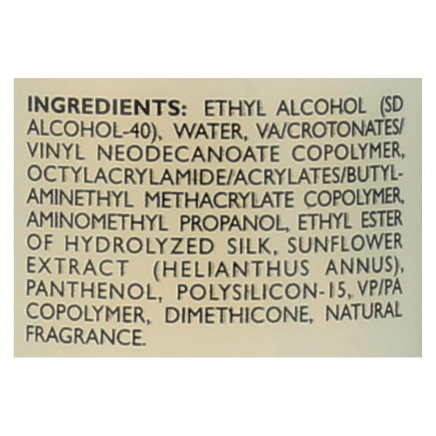 ingredients : sd alcohol-40. Water;aqua;va/crotonates / vinyl neodecanoate copolymer;octyl- acrylamide / acrylates / butyla- miniethyl methacrylate copolymer;ethyl ester of hydrolyzed silk;helianthus annus;sunflower;extract;panthenol;aminomethyl propanol;polysilicon-15;vp/va copolymer;dimethicone;copolyol natural fragrance