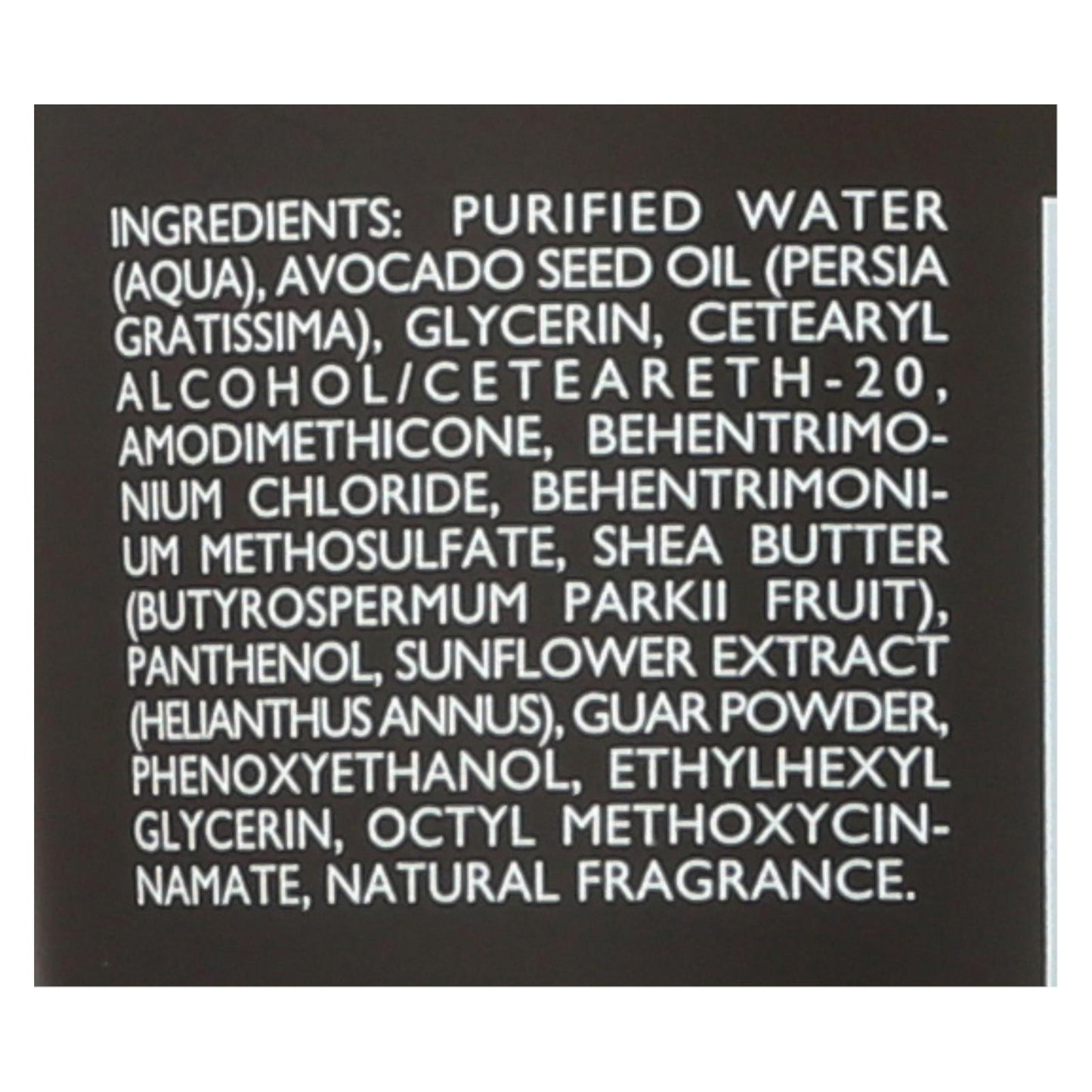 ingredients : purified water;aqua;avocado seed oil;persia gratissima;glycerin;cetearyl alcohol/ceteareth-20;amodimethicone;behentrimonium chloride;behentrimonium methosulfate;shea butter;butyrospermum parkii fruit;panthenol;sunflower extract;helianthus annus;guar powder;phenoxyethanol;ethylhexyl glycerin;octyl methoxycinnamate;natural fragrance