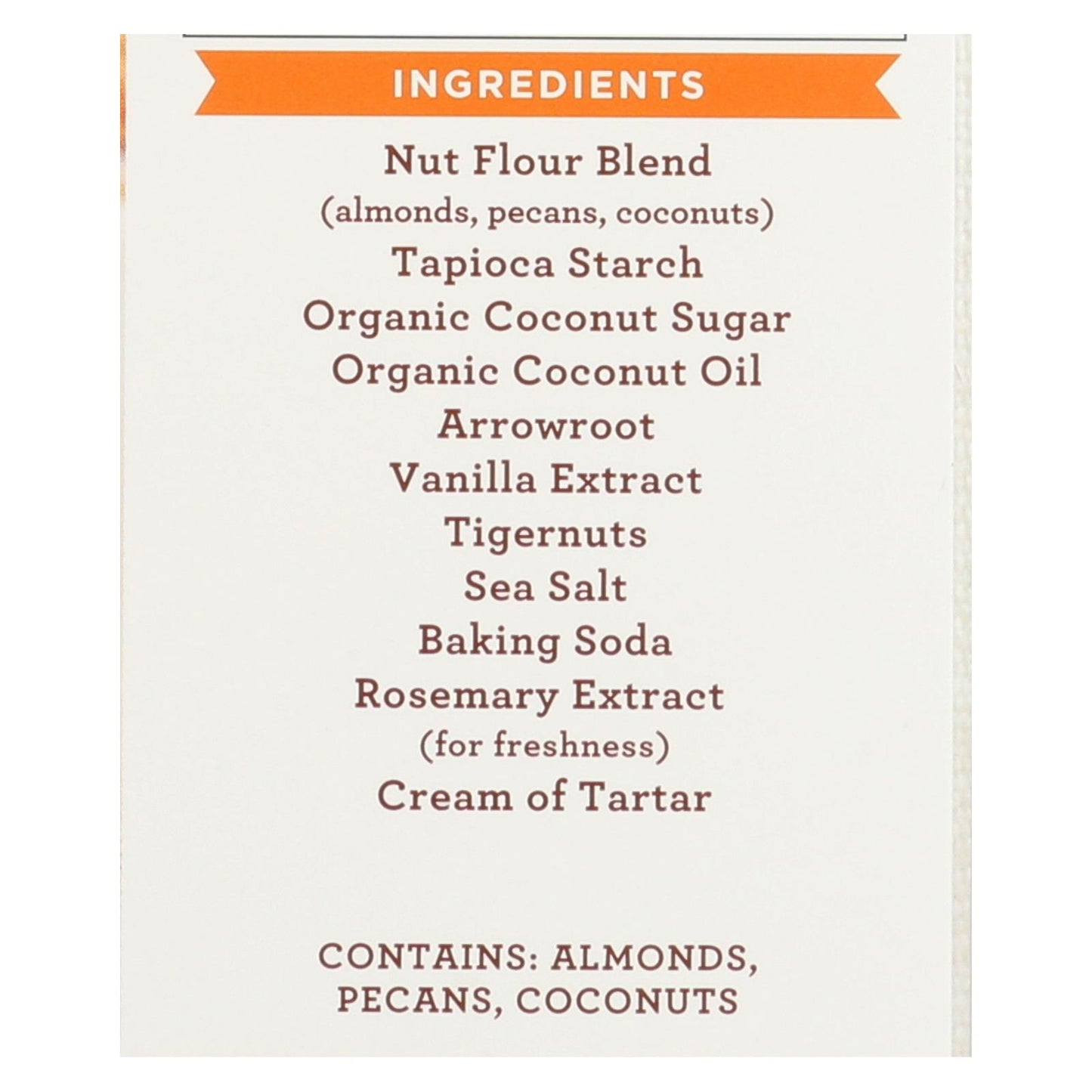 ingredients : nut flour blend;almonds;pecans;coconut;tapioca starch organic coconut sugar organic coconut oil arrowroot vanilla extract baking soda sea salt cream of tartar rosemary extract;for freshness