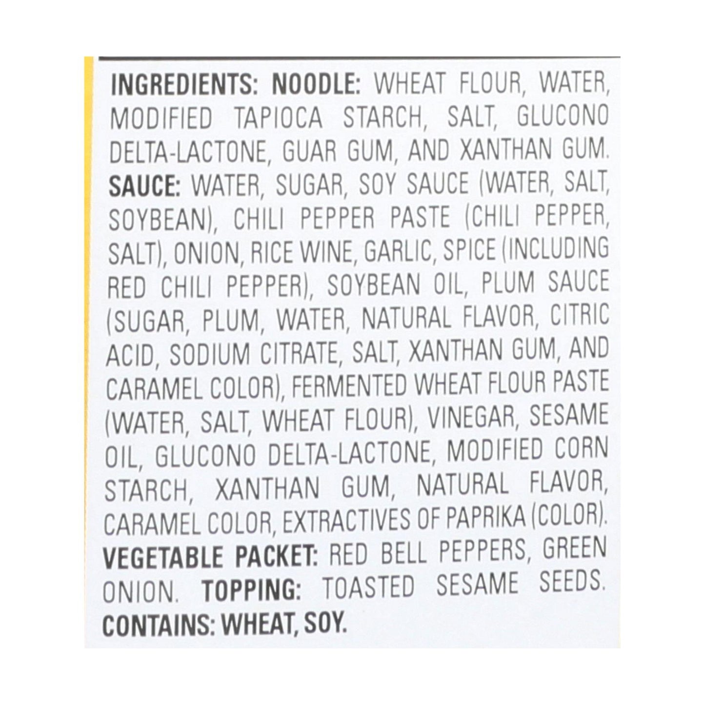 ingredients : noodle: wheat flour;water;modified tapioca starch;salt;glucono delta-lactone;guar gum;and xanthan gum. Sauce: water;sugar;soy sauce;soybean;chili pepper paste;chili pepper;onion;rice wine;garlic;spice;including red chili pepper;soybean oil;plum sauce;plum;natural flavor;citric acid;sodium citrate;xanthan gum;and caramel color;fermented wheat flour paste;wheat flour;vinegar;sesame oil;modified corn starch;caramel color;extractives of paprika;color;vegetable packet: red bell peppers;green onion. T