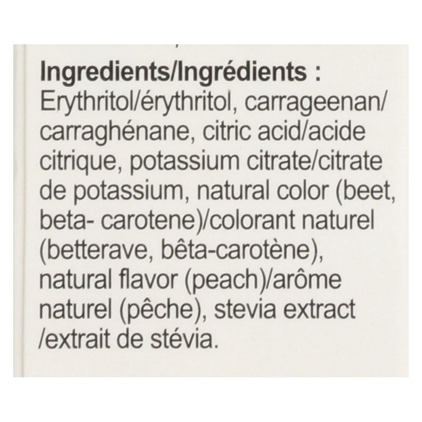 ingredients : erythritol;carrageenan;citric acid;potassium citrate;natural color;beta-carotene;natural flavor;peach;stevia extract