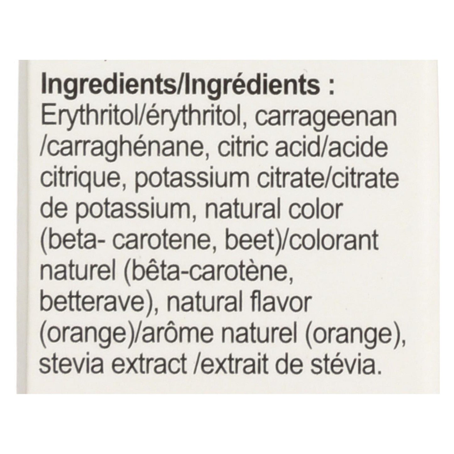 ingredients : erythritol;carrageenan;citric acid;potassium citrate;natural color;beta carotene;beet;natural flavor;orange;stevia extract