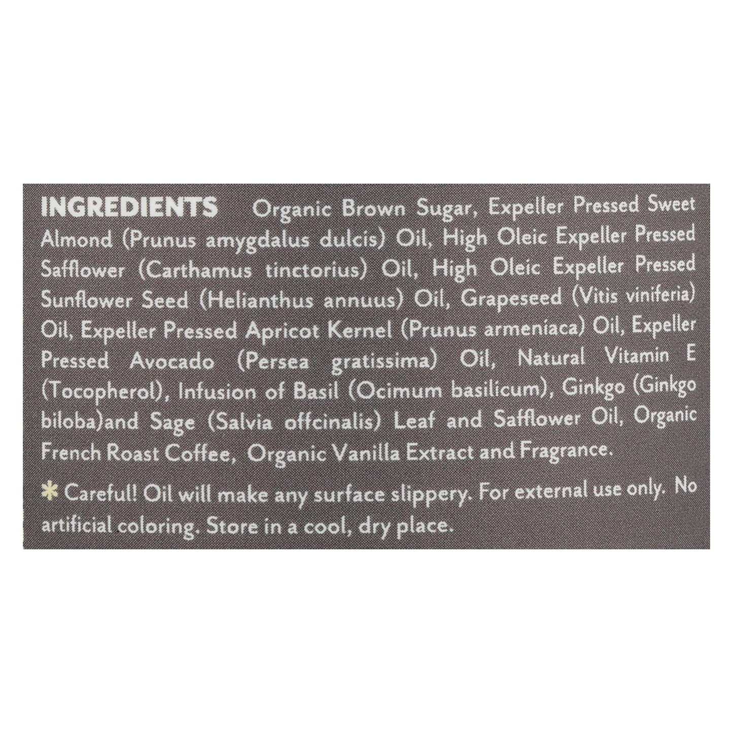 ingredients : organic brown sugar;expeller pressed sweet almond (prunus amygdalus dulcis) oil;high oleic expeller pressed safflower (carthamus tinctorius) oil;high oleic expeller pressed sunflower seed (helianthus annuus) oil;grapeseed (vitis viniferia) oil;expeller pressed apricot kernel (prunus armeniaca) oil;expeller pressed avocado (persea gratissima) oil;natural vitamin e (tocopherol);infusion of basil (ocimum basilicum);ginkgo (ginkgo biloba) and sage (salvia offcinalis) leaf and safflower oil;organic f