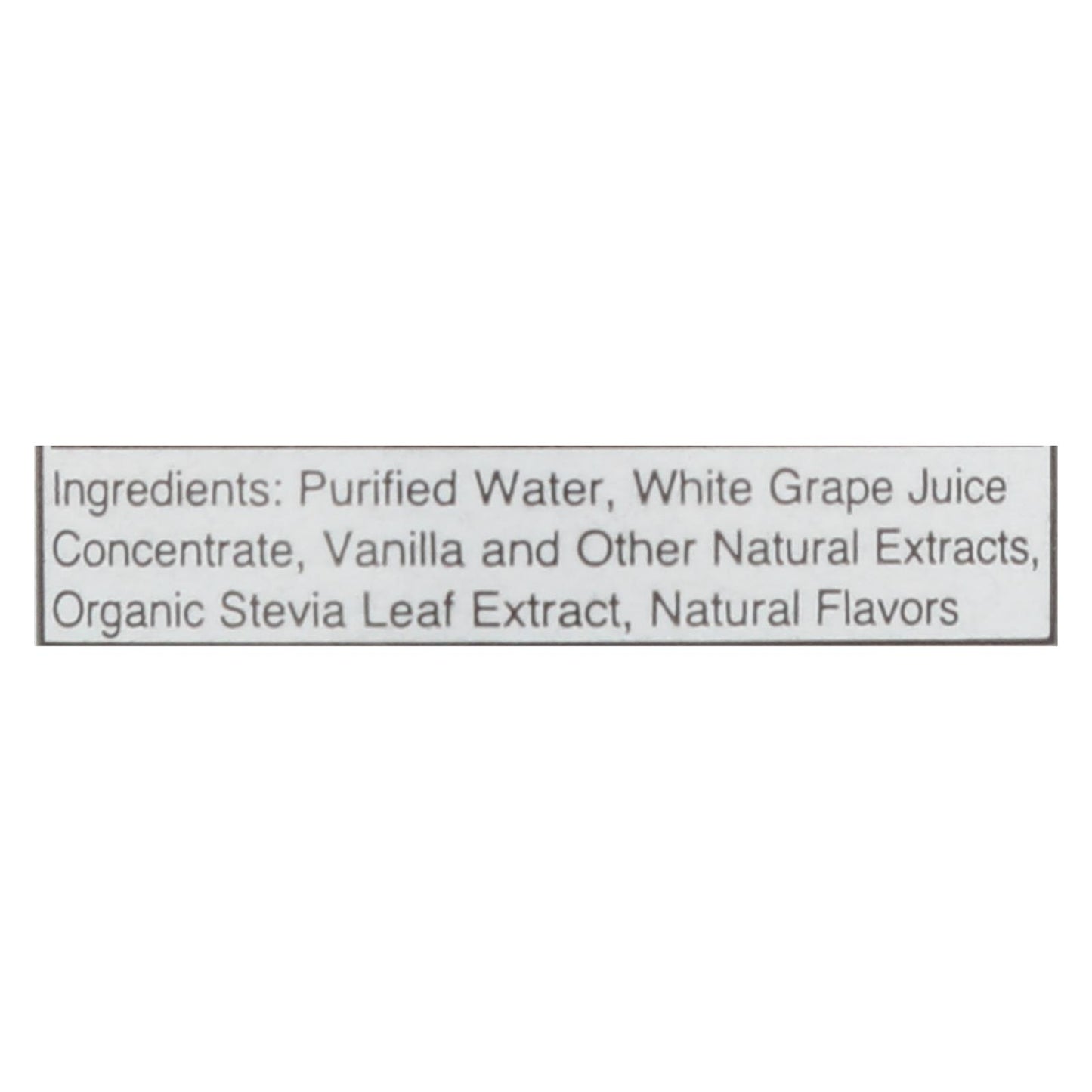 ingredients : purified water;white grape juice concentrate;vanilla and other natural extracts;organic stevia leaf extract;natural flavors