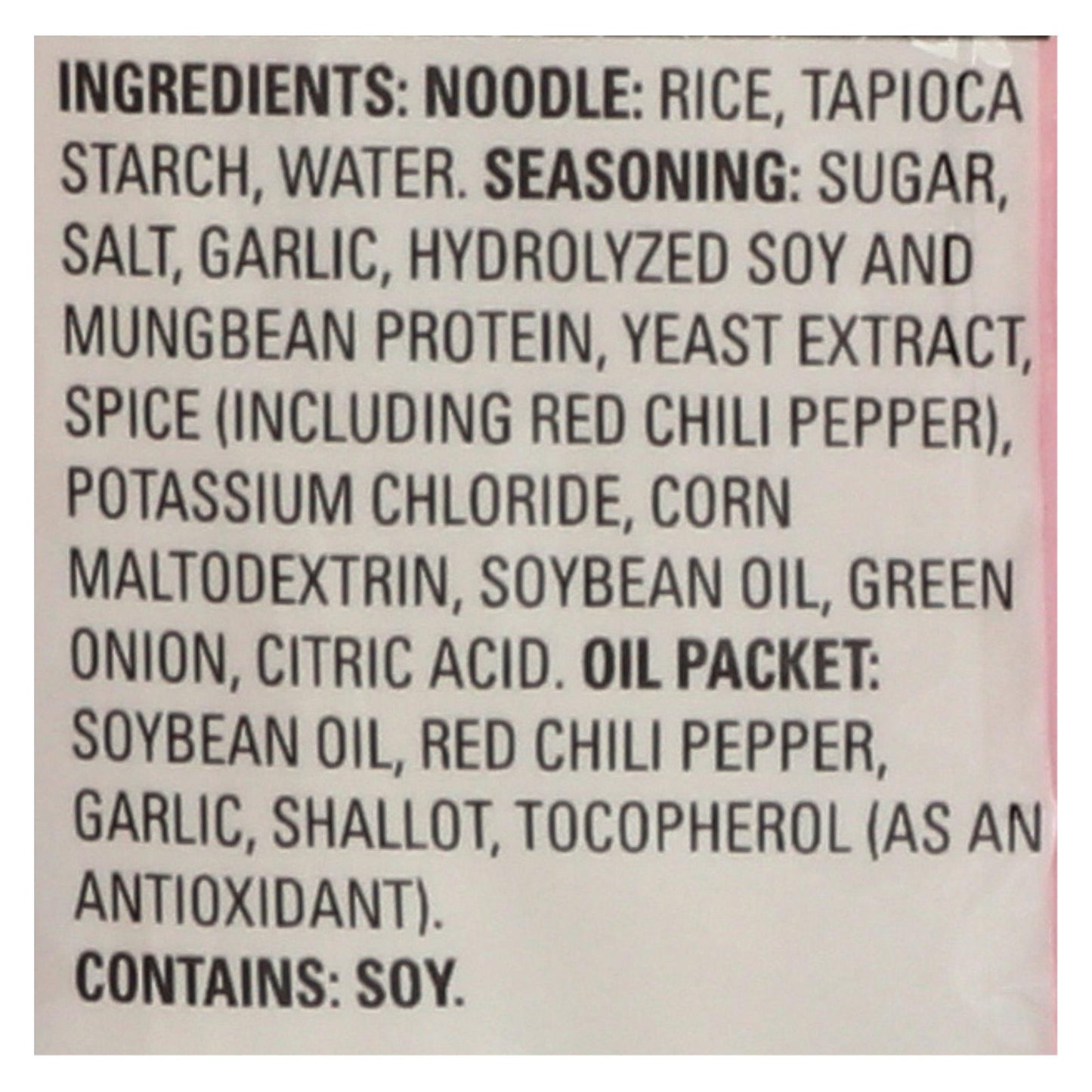 ingredients : noodle: rice;tapioca starch;water. Seasoning: sugar;salt;garlic;hydrolyzed soy and mungbean protein;yeast extract;spice;including red chili pepper;potassium chloride;corn maltodextrin;soybean oil;green onion;citric acid. Oil packet: soybean oil;red chili pepper;shallot;tocopherol;as an antioxidant