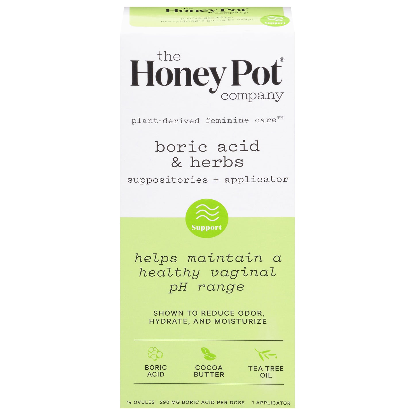 14 ovules. Soothe. Boric Acid: Antifungal. Cocoa Butter: Moisturizing. Tea Tree Oil: Antibacterial. Plant-based feminine care. You've got this. Everything's gonna be okay. Made by humans with vaginas for humans with vaginas because it takes one to know one. I was suffering with bacterial vaginosis for 8 months when an ancestor came to me in a dream and gifted me with a vision to heal myself. With her help I created The Honey Pot Co to solve for what other brands wouldn't, through the power of herbs. thehoneypot.co. Some discharge over the course of the night is normal. For added comfort and protection, wear a honey pot herbal pantiliner. Avoid sexual intercourse while using suppository. (These statements have not been evaluated by the Food and Drug Administration. This product is not intended to diagnose, treat, cure, or prevent any disease. The information provided does not constitute medical advice and should not take the place of consulting a physician. This information does not and should not replace treatment from a medical professional. If you need medical advice or assistance, you should consult a physician.) Made in Italy.