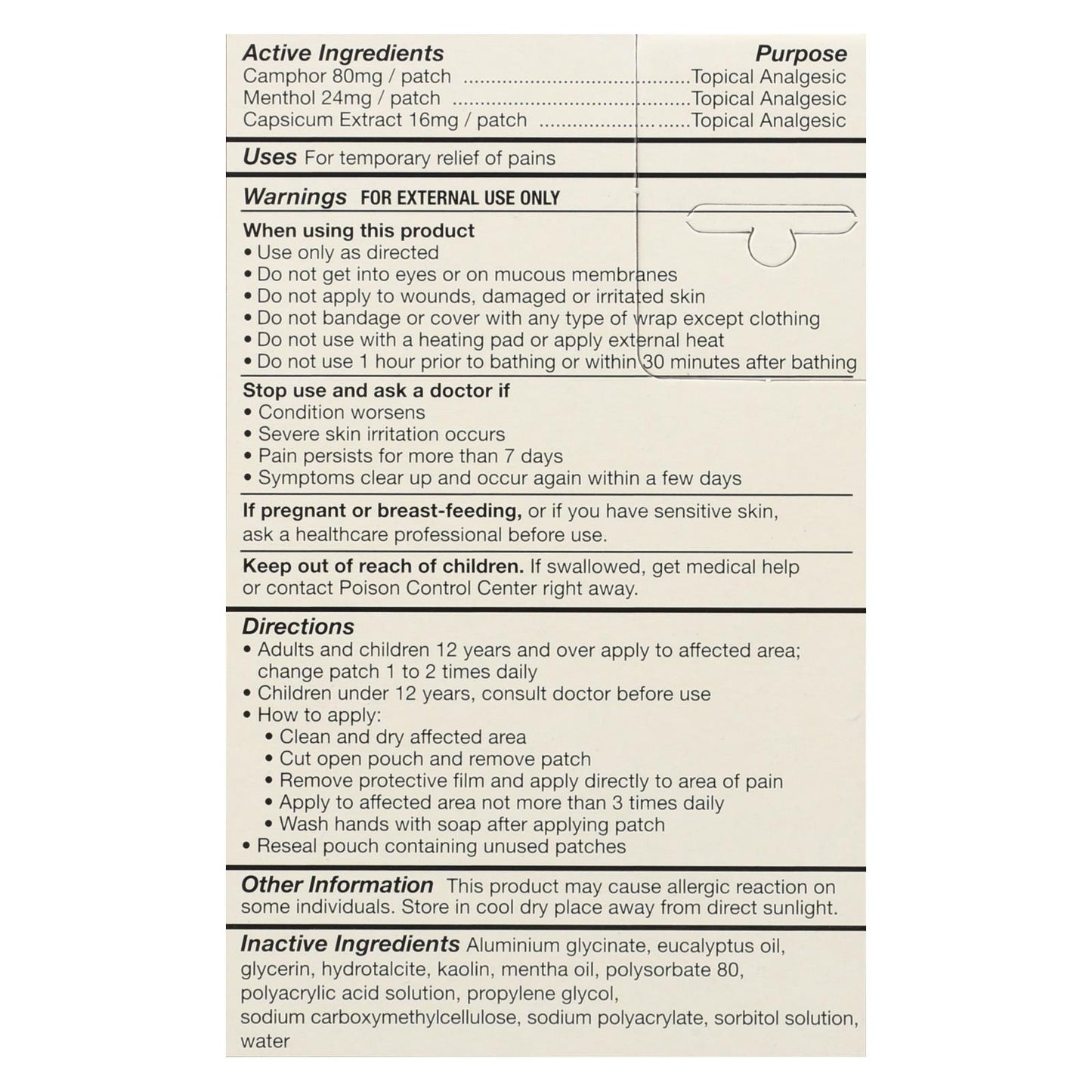 ingredients : aluminium glycinate;eucalyptus oil;glycerin;hydrotalcite;kaolin;mentha oil;polysorbate 80;polyacrylic acid solution;propylene glycol;sodium carboxymehylcellulose;sodium polyacrylate;sorbitol solution;water;camphor 80mg / patch purpose topical analgesic menthol 24mg / patch purpose topical analgesic capsicum extract 16mg / patch purpose topical analgesic