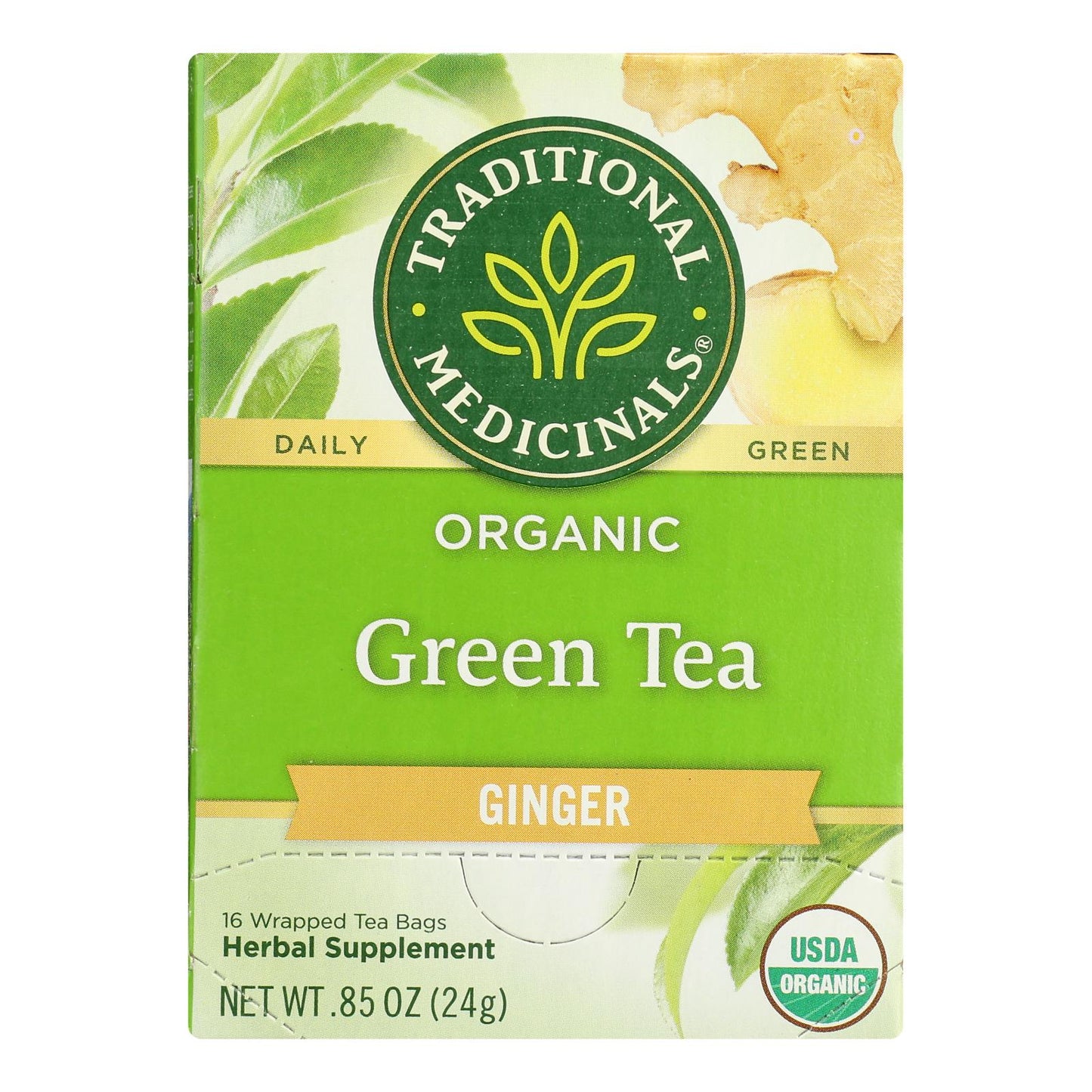 TRADITIONAL MEDICINALS' GREEN TEA GINGER BAGGED TEA IS MADE WITH CERTIFIED USDA ORGANIC, FAIRTRADE CERTIFIED AND VERIFIED NON-GMO INGREDIENTS. EACH BOX CONTAINS 16 NATURALLY CAFFEINATED TEA BAGS. INGREDIENTS LIKE GINGER AND GREEN TEA LEAVES PROMOTE HEALTHY DIGESTION. SEE LABEL FOR WARNINGS AND RISKS.