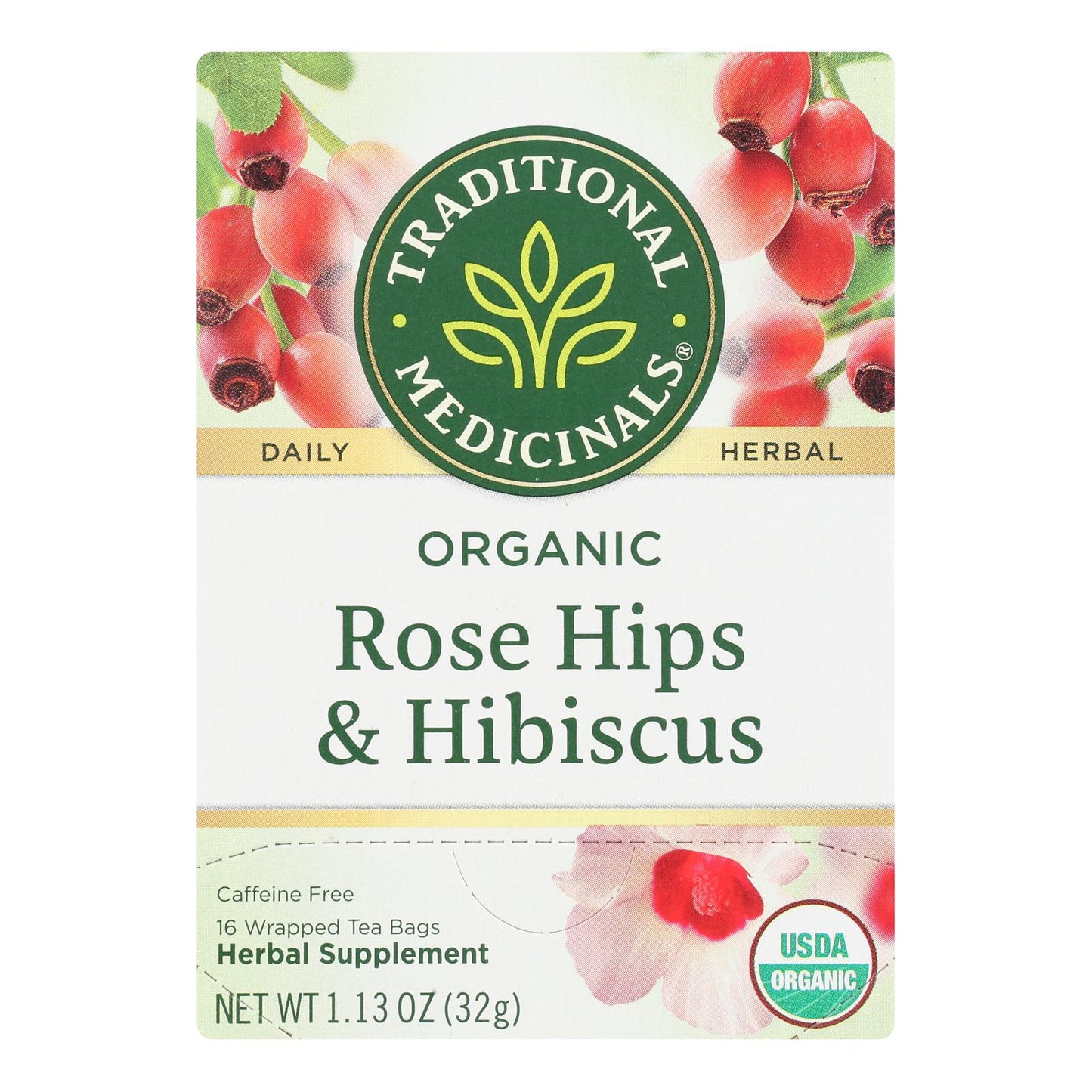 TRADITIONAL MEDICINALS' ROSE HIPS WITH HIBISCUS BAGGED TEA IS MADE WITH CERTIFIED USDA ORGANIC AND VERIFIED NON-GMO INGREDIENTS. EACH BOX CONTAINS 16 TEA BAGS OF OUR NATURALLY CAFFEINE FREE HERBAL TEA. THE PRIMARY INGREDIENT, ROSE HIPS, OFFERS A ROBUST AND TANGY BERRY CHARACTER. SEE LABEL FOR WARNINGS AND RISKS.