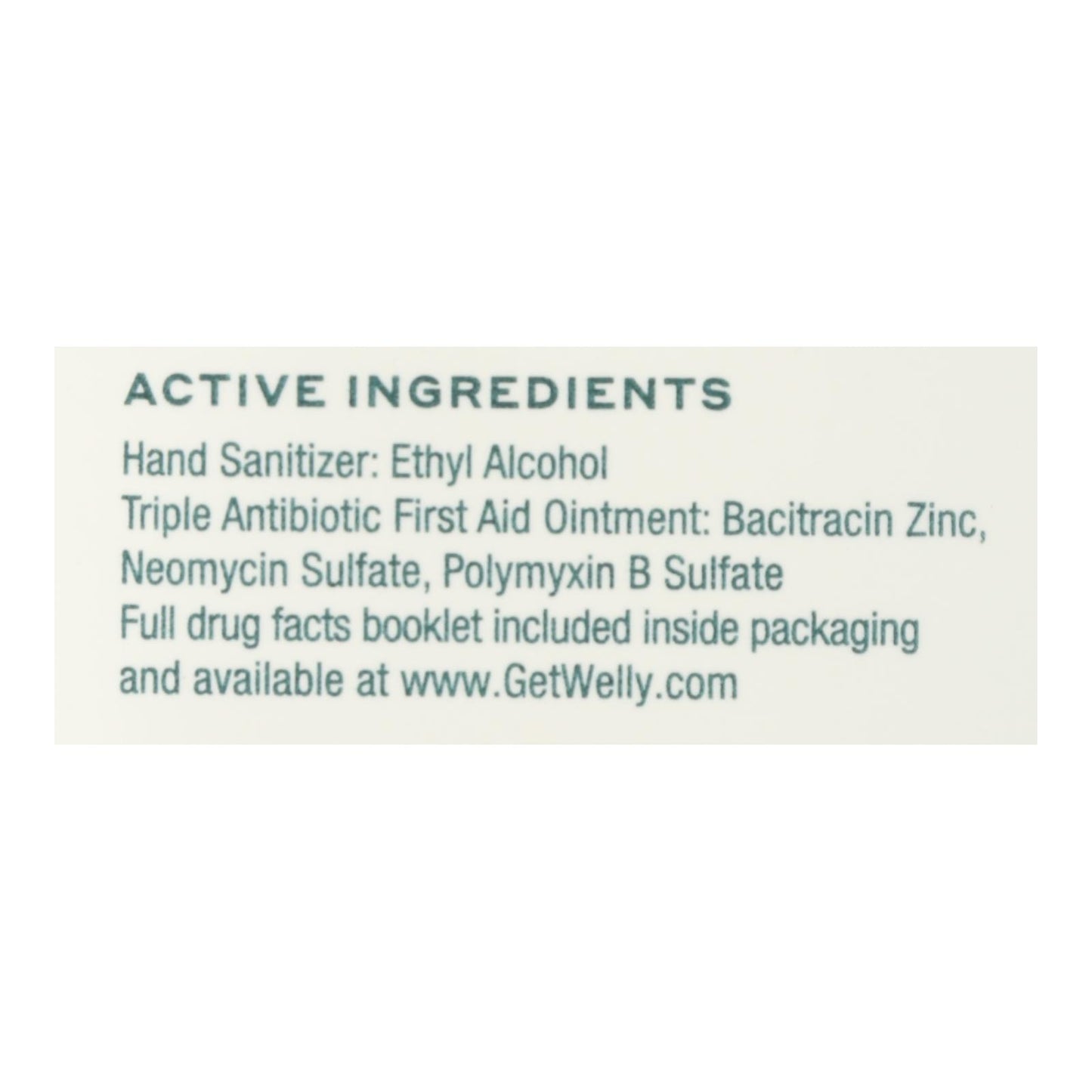 Assorted bandages & ointments. Quick Fix Kit: 9 bandages - 3/4 x 3 in (1.9 x 7.6 cm); 9 bandages - 5/8 x 2-1/4 in (1.6 x 5.7 cm); 3 - triple antibiotic 0.5 g (1/57 oz); 3 - hand sanitizer 0.9 g (1/32 oz). 24 count. On the go first aid kit. First aid. First Aid Kit sized for on-the-go with everything you'll need and nothing you won't. Flexible fabric bandages in two sizes and a few colors to cover cuts and scratches. Hand sanitizer helps keep hands clean when there's no sink in sight. Triple Antibiotic ointment helps prevent infection. Product not made with natural rubber latex. Bandages are sterile unless individual wrapped opened. www.GetWelly.com. Full drug facts booklet included inside packaging and available at www.GetWelly.com. Recycle me! Products of USA and China with globally sourced materials.