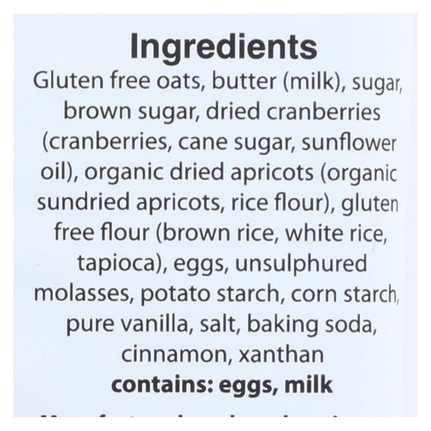 ingredients : gluten free oats;butter;milk;sugar;brown sugar;dried cranberries;cranberries;cane sugar;sunflower oil;organic dried apricots;organic sundried apricots;rice flour;gluten free flour;brown rice;white rice;tapioca;eggs;unsulphured molasses;potato starch;corn starch;pure vanilla;salt;baking soda;cinnamon;xanthan