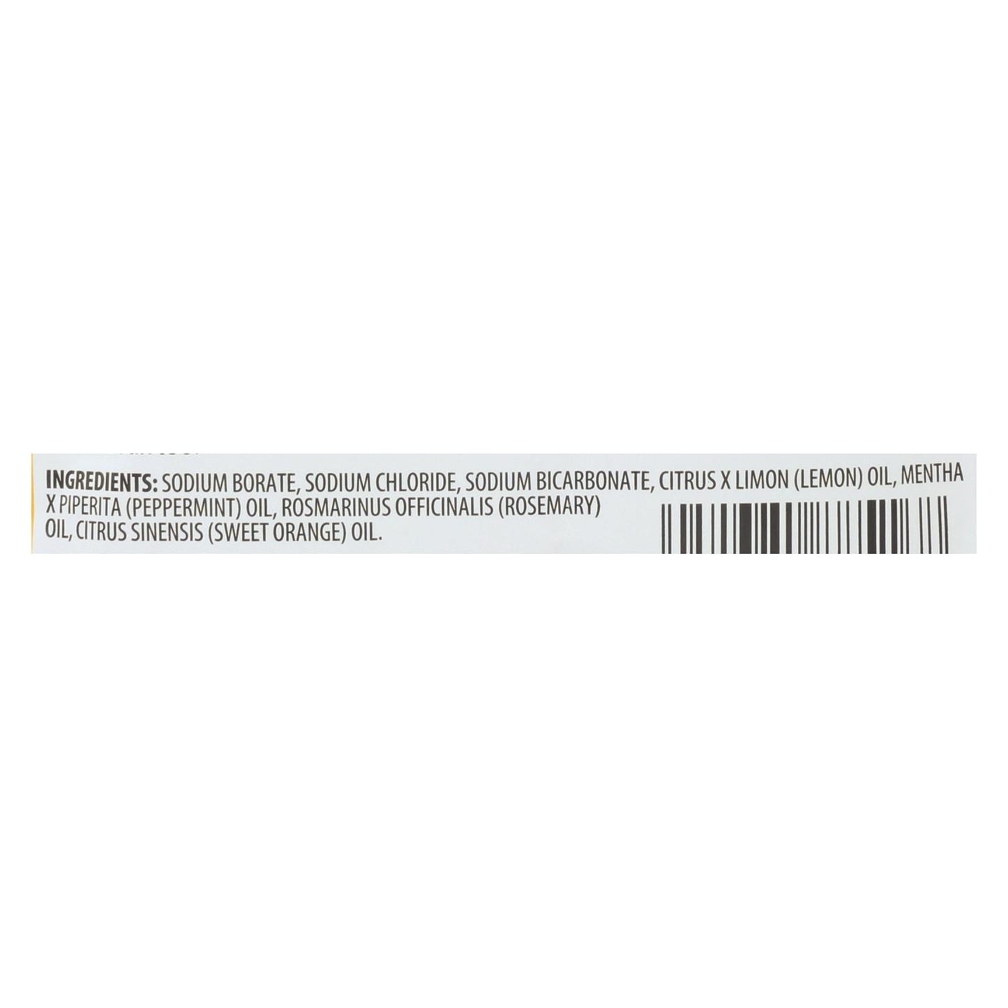 ingredients : sodium borate;sodium chloride;sodium bicarbonate;citrus x limon;lemon;oil;mentha x piperita;peppermint;rosmarinus officinalis;rosemary;citrus sinensis;sweet orange
