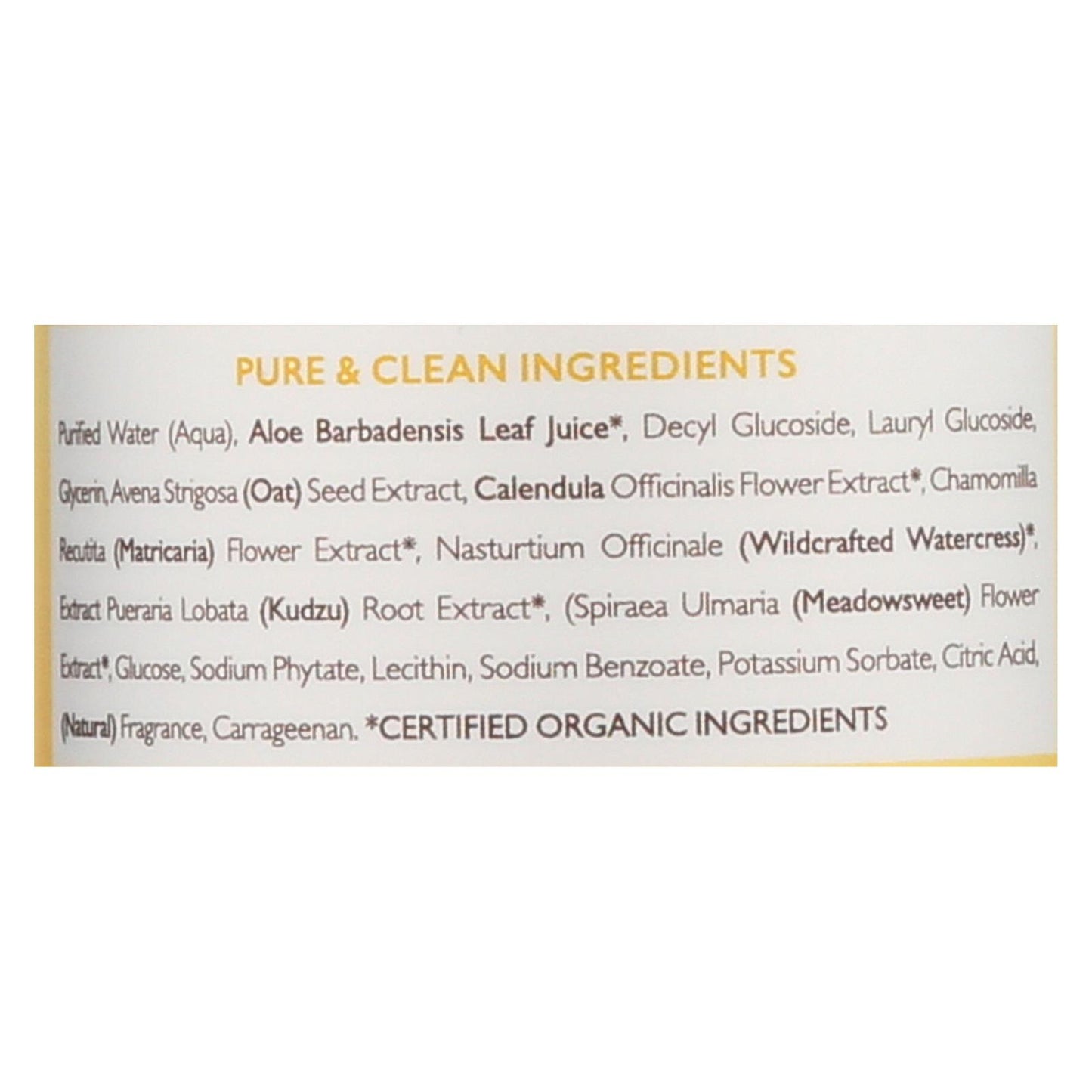 ingredients : pure & clean purified water;aqua;aloe barbadensis leaf juice;decyl glucoside;lauryl glucoside;glycerin;avena strigosa;oat;seed extract;calendula officinalis flower extract;chamomilla recutita;matricaria;flower extract;nasturtium officinale;wildcrafted watercress;extract pueraria lobata;kudzu;root extract;spiraea ulmaria;meadowsweet;glucose;sodium phytate;lecithin;sodium benzoate;potassium sorbate;citric acid;natural;fragrance;carrageenan
