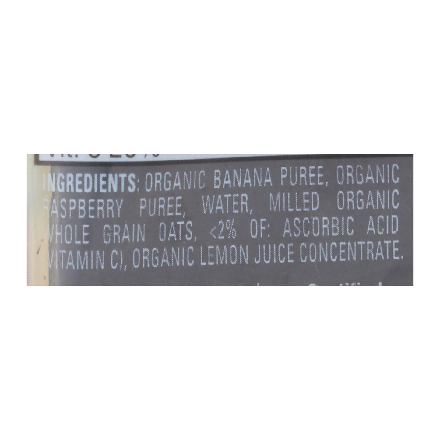 ingredients : organic banana puree;organic raspberry puree;water;milled organic whole grain gluten free oats;<1% of: ascorbic acid;vitamin c;organic lemon juice concentrate