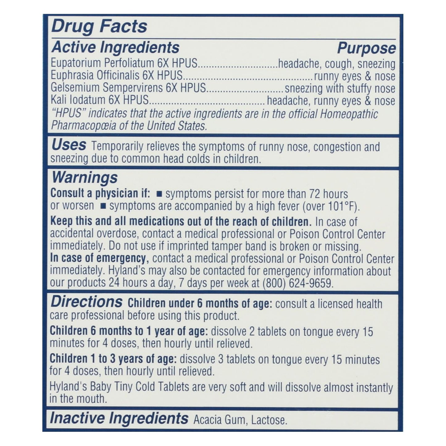 Hyland's baby tiny cold tablets are made from homeopathic ingredients such as kali iodatum and gelsemium sempervirens to promote natural relief for runny noses, sneezing and congestion due to colds. Designed for kids ages 6 months to 3 years, this remedy is free of parabens, artificial flavors and dyes. Give your child two to three tablets every 15 minutes for the first four doses, then repeat hourly until symptoms are relieved. This bottle contains 125 quick-dissolving tablets.