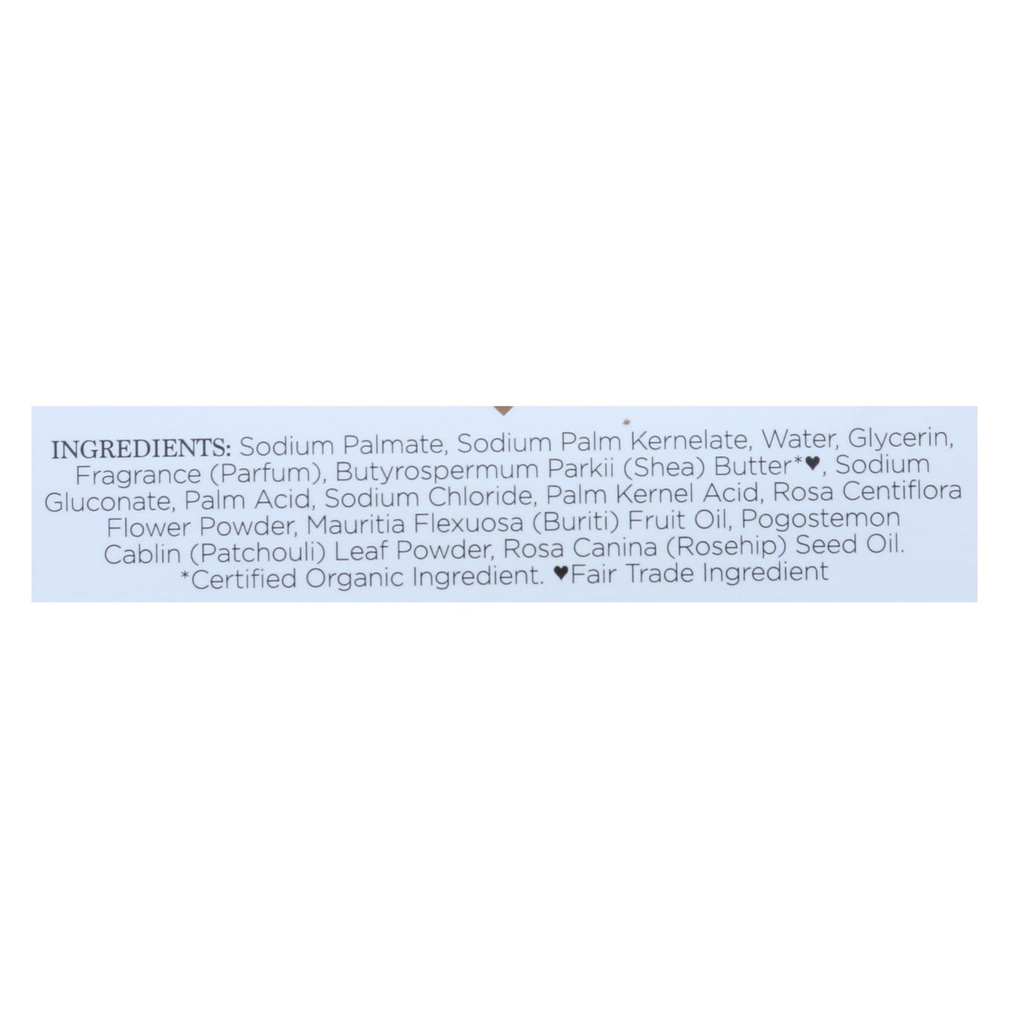 ingredients : sodium palmate;sodium palm kernelate;water;glycerin;fragrance;parfum;butyrospermum parkii;shea;butter*♥;sodium gluconate;palm acid;sodium chloride;palm kernel acid;rosa centiflora flower powder;mauritia flexuosa;buriti;fruit oil;pogostemon cablin;patchouli;leaf powder;rosa canina;rosehip;seed oil
