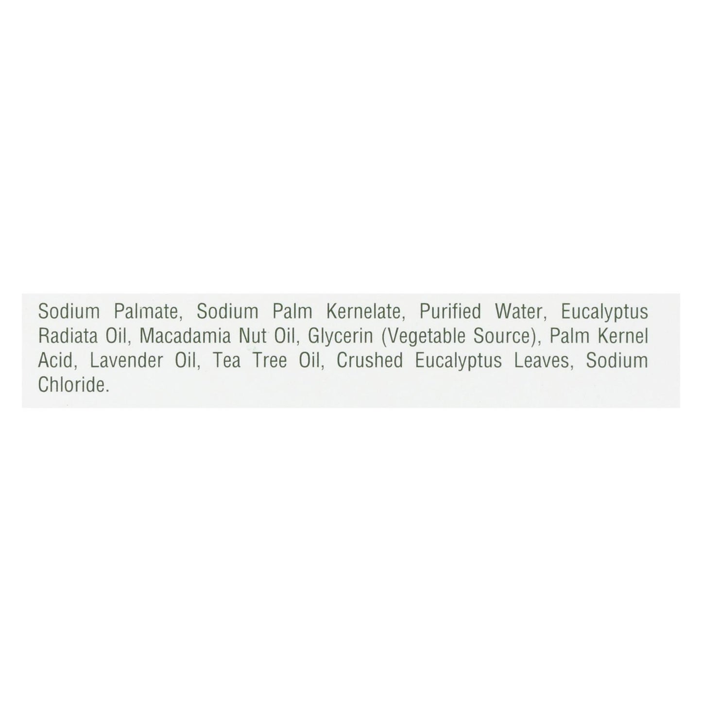 ingredients : sodium palmate;sodium palm kernelate;purified water;eucalyptus radiata oil;macadamia nut oil;glycerin;vegetable source;palm kernal acid;lavender oil;tea tree oil;crushed eucalyptus leaves;sodium chloride
