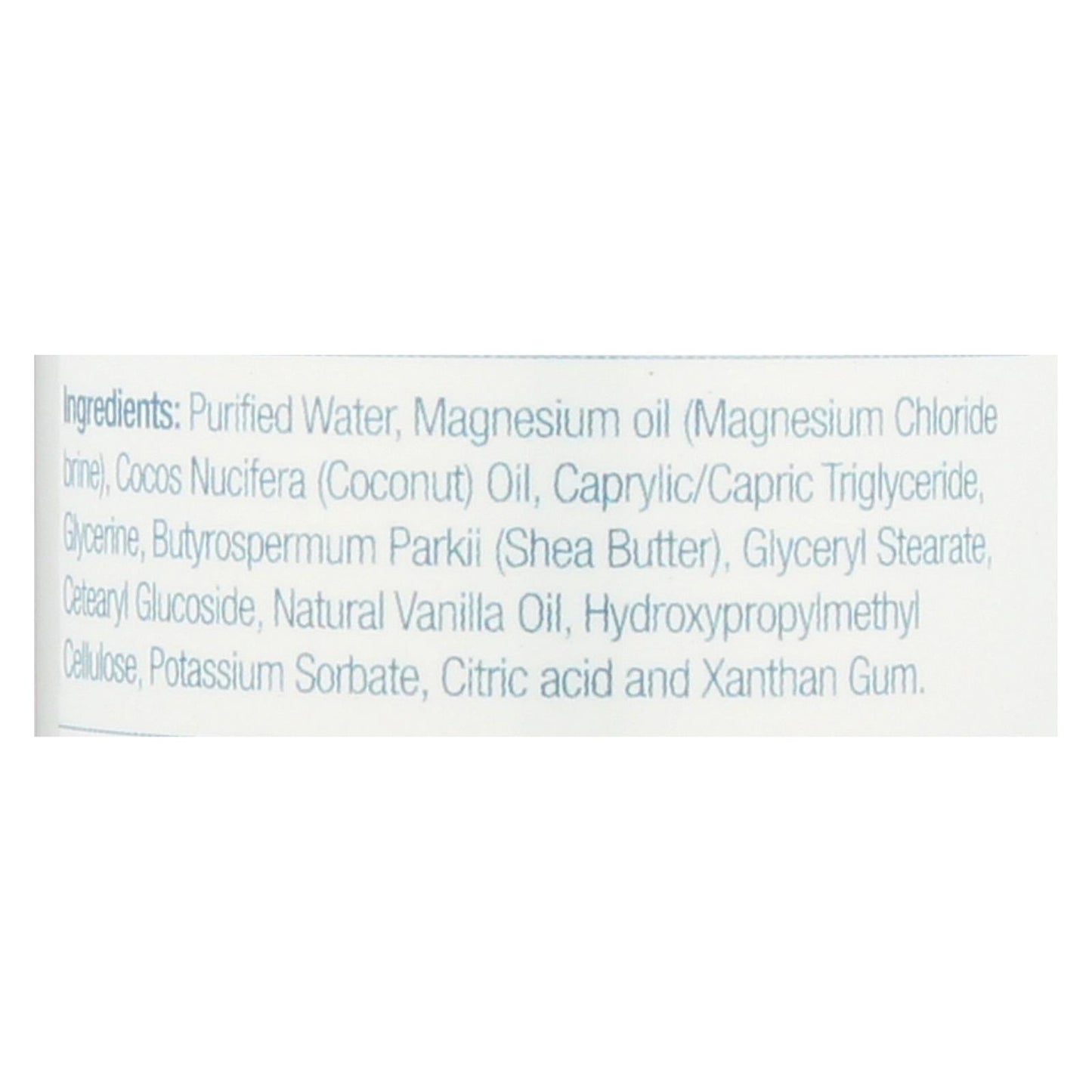 ingredients : purified water;magnesium oil;magnesium chloride brine;cocos nucifera;coconut;oil;caprylic capric triglyceride;glycerine;butyrospermum parkii;shea butter;glyceryl stearate;cetearyl glucoside;vanilla oil;hydroxypropylmethyl cellulose;potassium sorbate;citric acid and xanthan gum