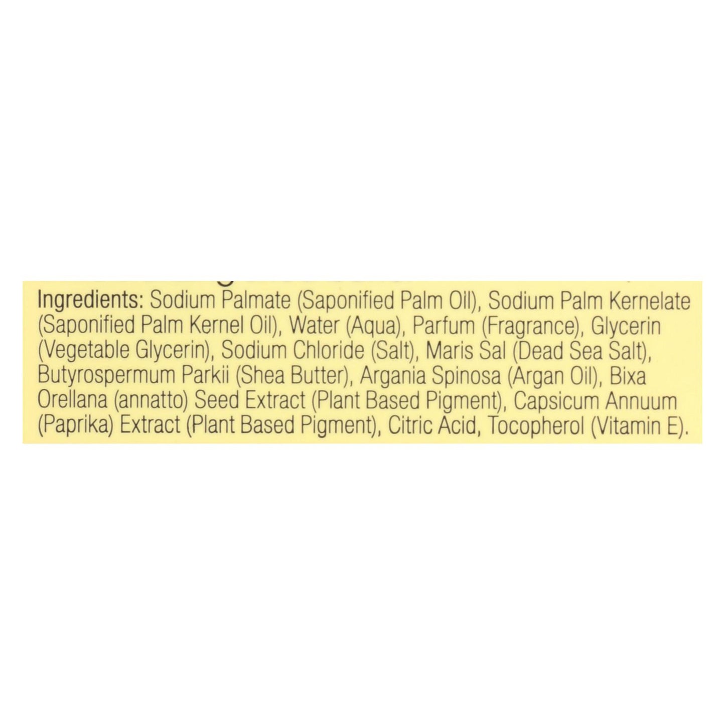 ingredients : sodium palmate;saponified palm oil;sodium palm kernelate;saponified palm kernel oil;water;aqua;parfum;fragrance;glycerin;vegetable glycerin;sodium chloride;salt;maris sal;dead sea salt;butyrospermum parkii;shea butter;argania spinosa;argan oil;bixa orellana;annatto;seed extract;plant based pigment;capsicum annuum;paprika;extract;citric acid;tocopherol;vitamin e