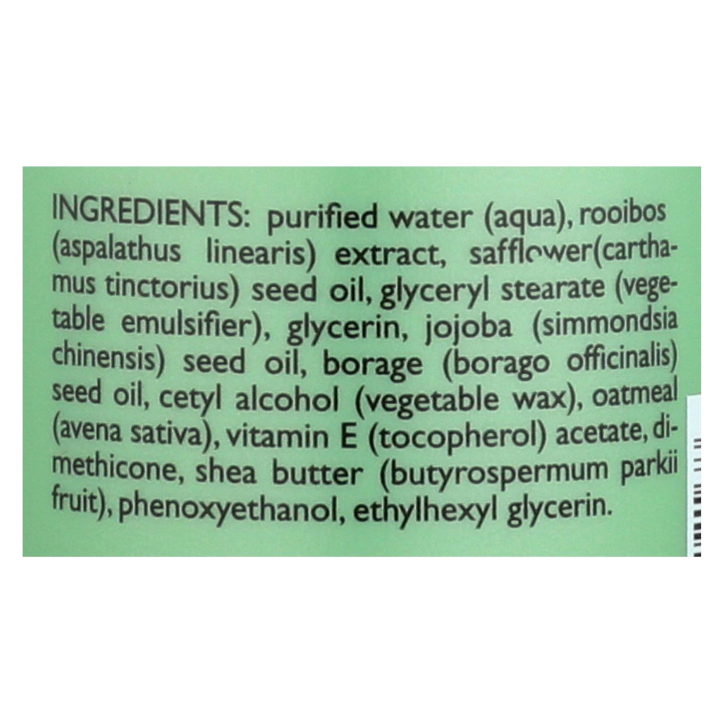 ingredients : purified water;aqua;rooibos;aspalathus linearis;extract;safflower;carthamus tinctorius;seed oil;glyceryl stearate;vegetable emulsifier;glycerin;jojoba;simmondsia chinesis;borage;borago officinalis;cetyl alcohol;vegetable wax;oatmeal;avena sativa;vitamin 3;tocopherol;acetate;dimethicone;shea butter;butyrospermum parkii fruit;phenoxyethanol;ethylhexyl glycerin