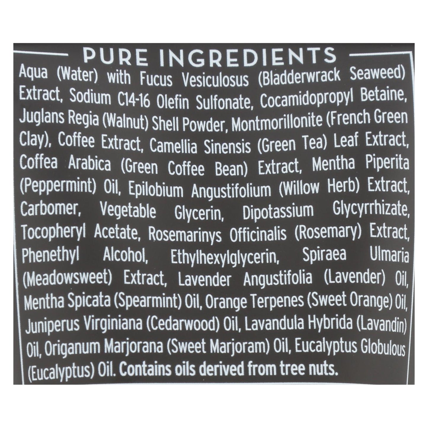 ingredients : aqua;water;with focus cesiculosus;bladderwrack seaweed;extract;sodium c14-16 olefin sulfonate;cocamidopropyl betaine;juglans regia;walnut;shell powder;montmorillonite;french green clay;coffee extract;camellia sinensis;green tea;leaf extract;coffea arabica;green coffee bean;mentha piperita;peppermint;oil;epilobium angustifolium;willow herb;carbomer;vegetable glycerin;dipotassium glycyrrhizate;tocopheryl acetate;rosemarinus officinalis;rosemary;extract phenethyl alcohol;ethylhexylglycerin;spiraea