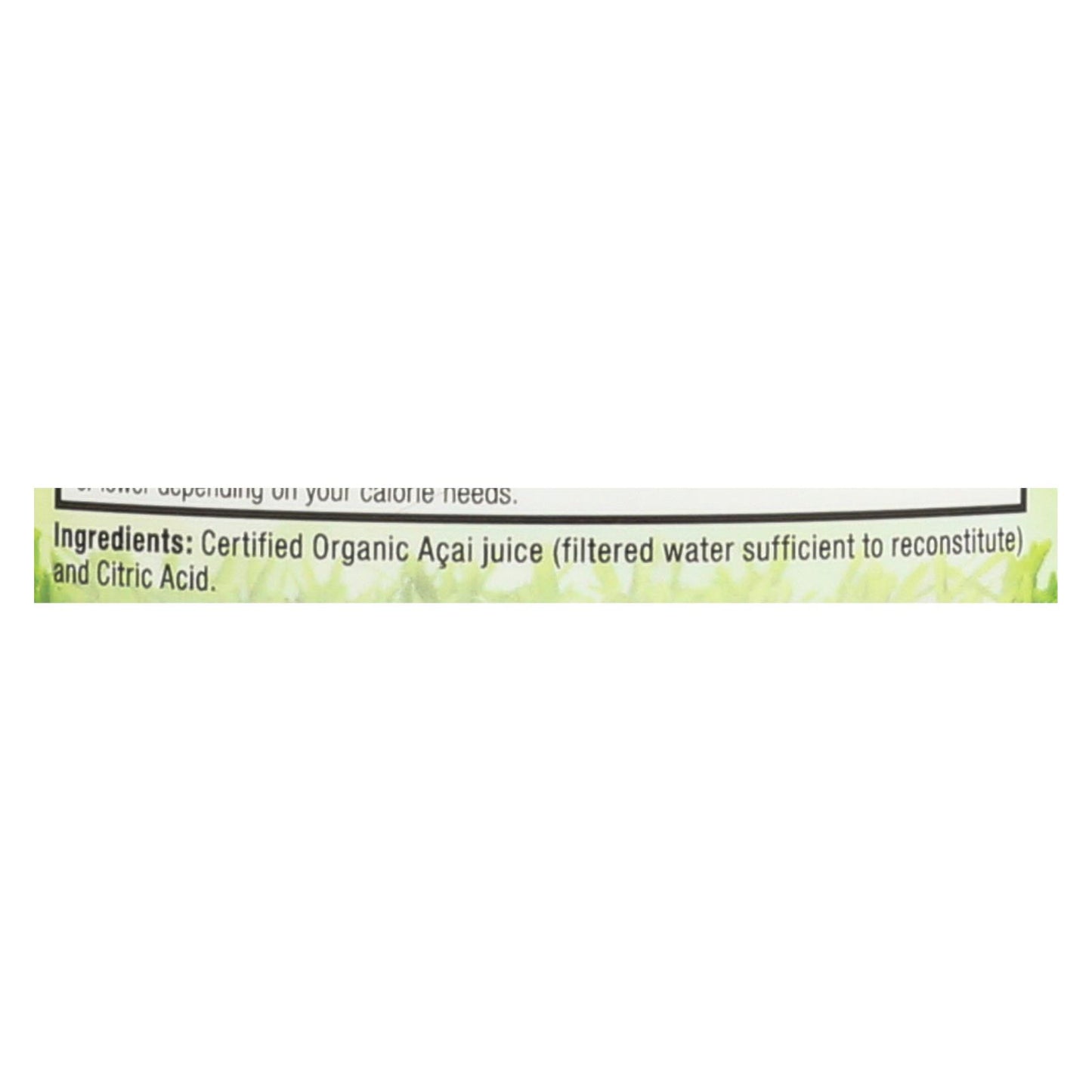 ingredients : certified organic acai juice;filtered water sufficient to reconstitute;and citric acid